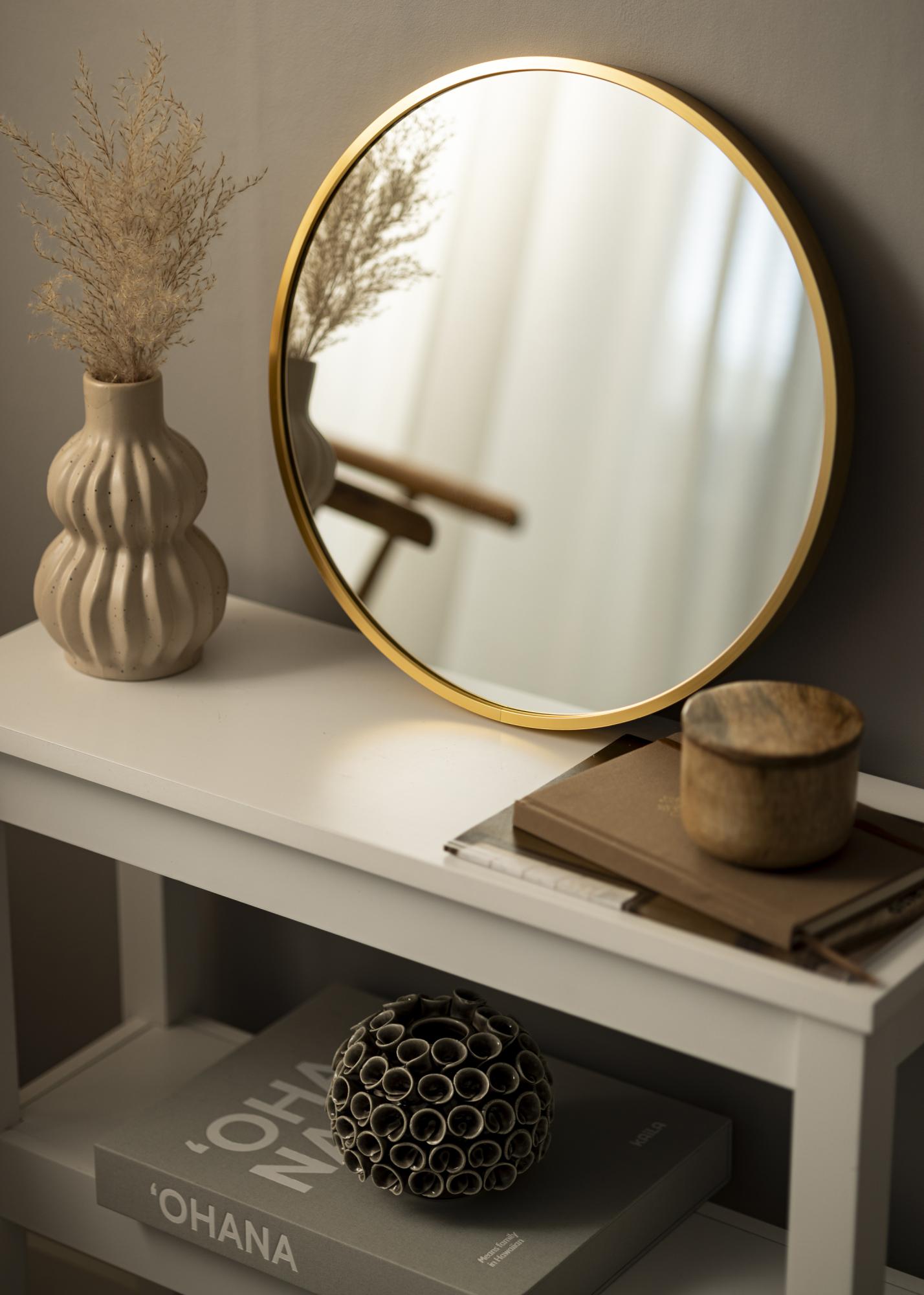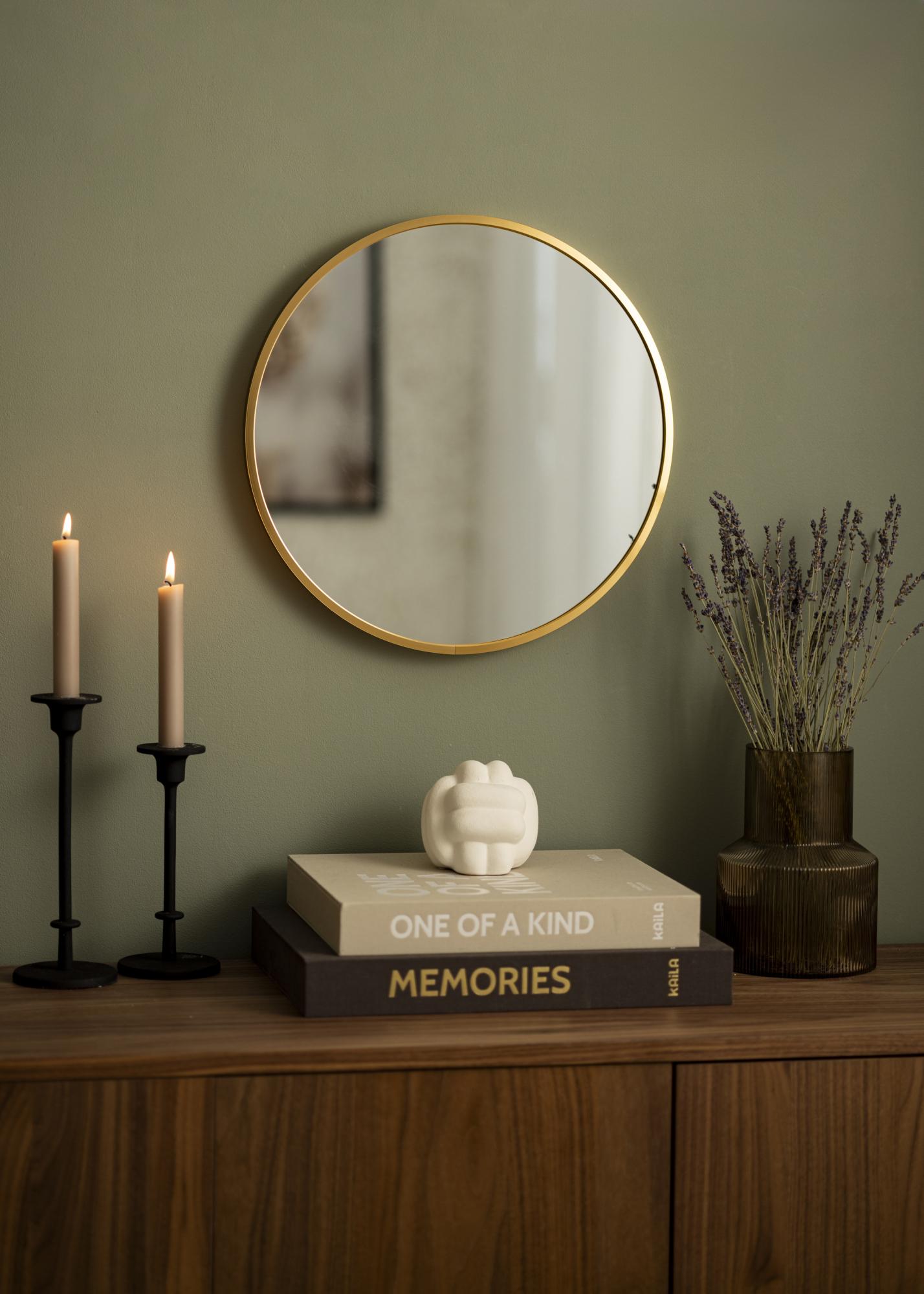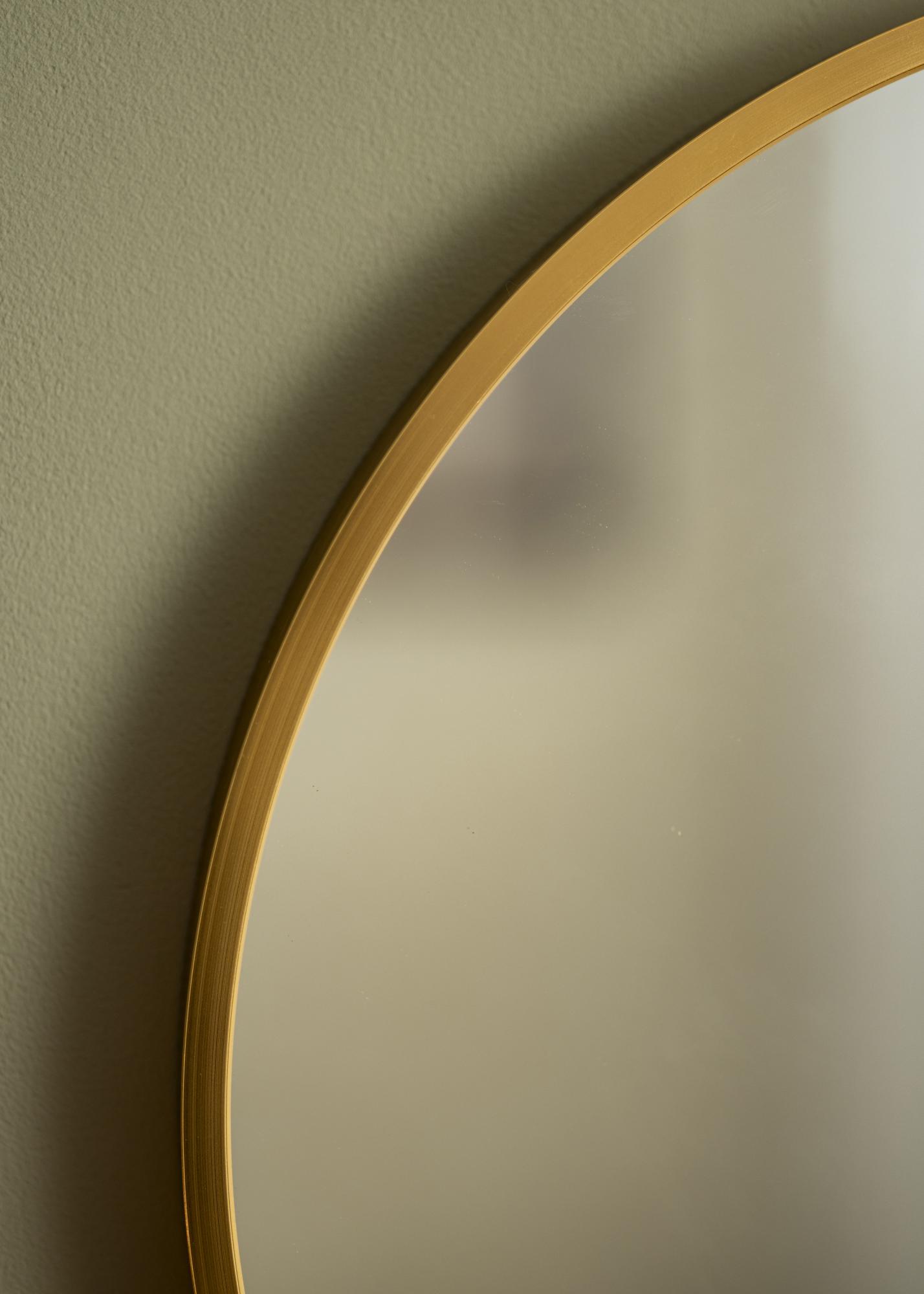 O oglindă rotundă cu un design suedez elegant, având un cadru metalic cu un finisaj auriu frumos. Cadrul are o suprafață periată, ceea ce conferă auriului strălucitor un aspect ușor mat. Cadrul este, de asemenea, în trend, fiind subțire, dar în același timp – în funcție de dimensiune – are o adâncime de 30-40 mm, ceea ce îl face să iasă puțin din perete și să creeze un efect 3D impresionant. Adâncimea cadrului face, de asemenea, ca oglinda să pară solidă și robustă, fără a îndepărta senzația minimalistă a oglinzii.