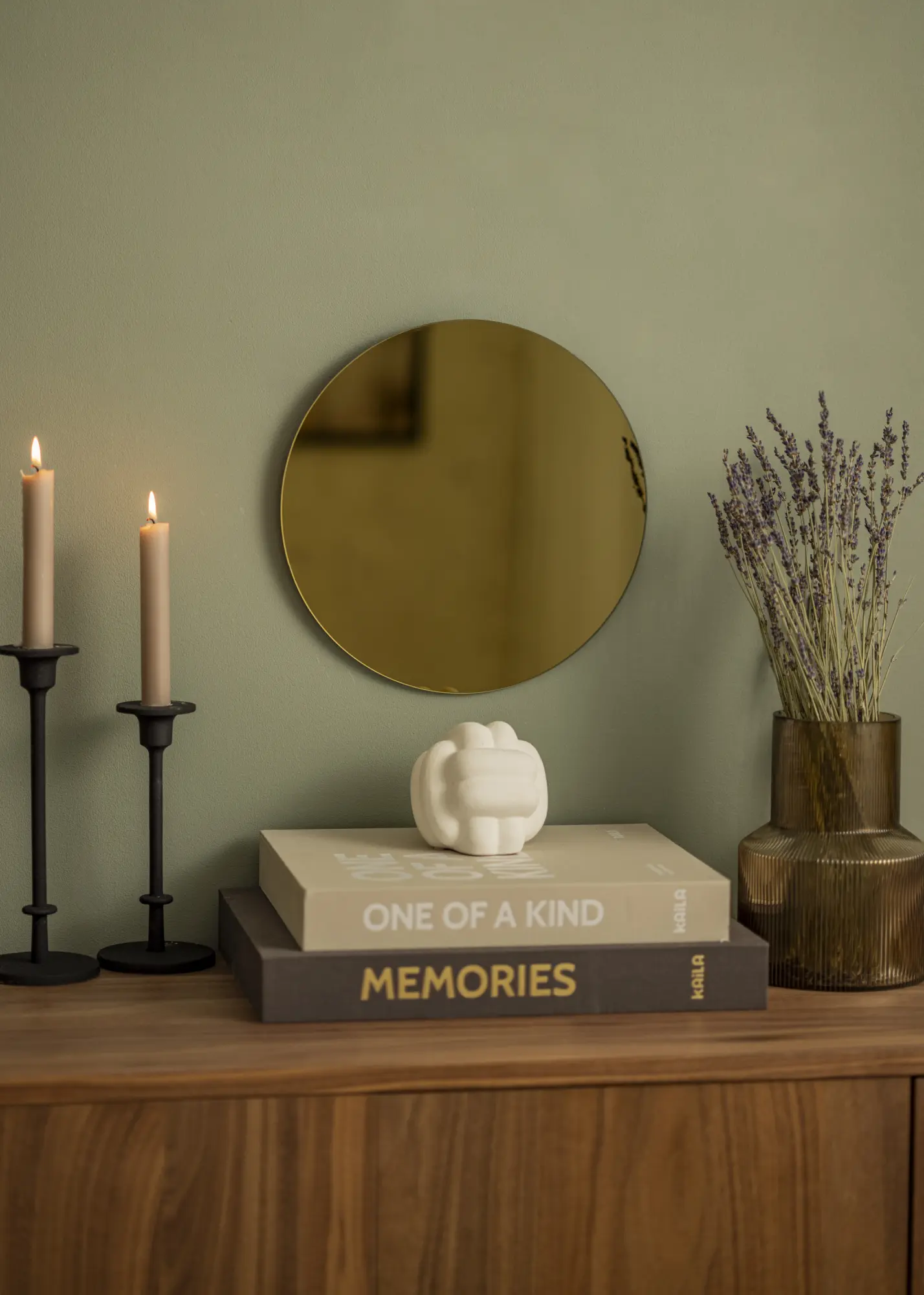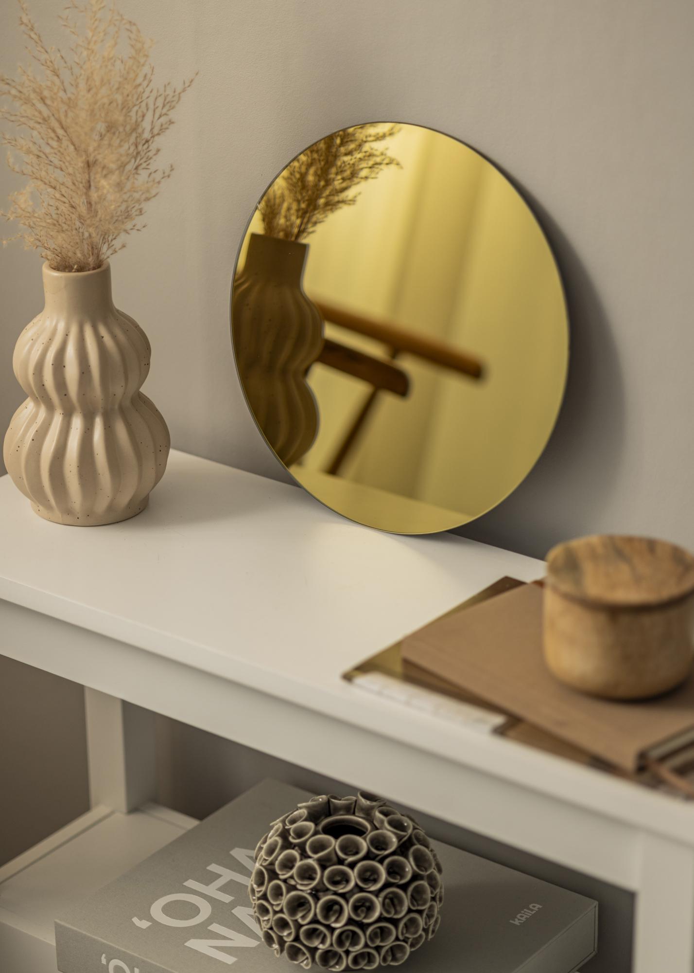 Această oglindă rotundă este elegantă și simplă – în timp ce se simte luxoasă și exclusivistă. Aceasta se datorează combinației fericite de detalii impresionante și formă simplificată. Oglinda este subțire și nu are ramă, ceea ce contribuie la aspectul său stilat. Sticla oglinzii cu ton auriu contribuie la ridicarea întregului și adăugarea unei senzații de exclusivitate.