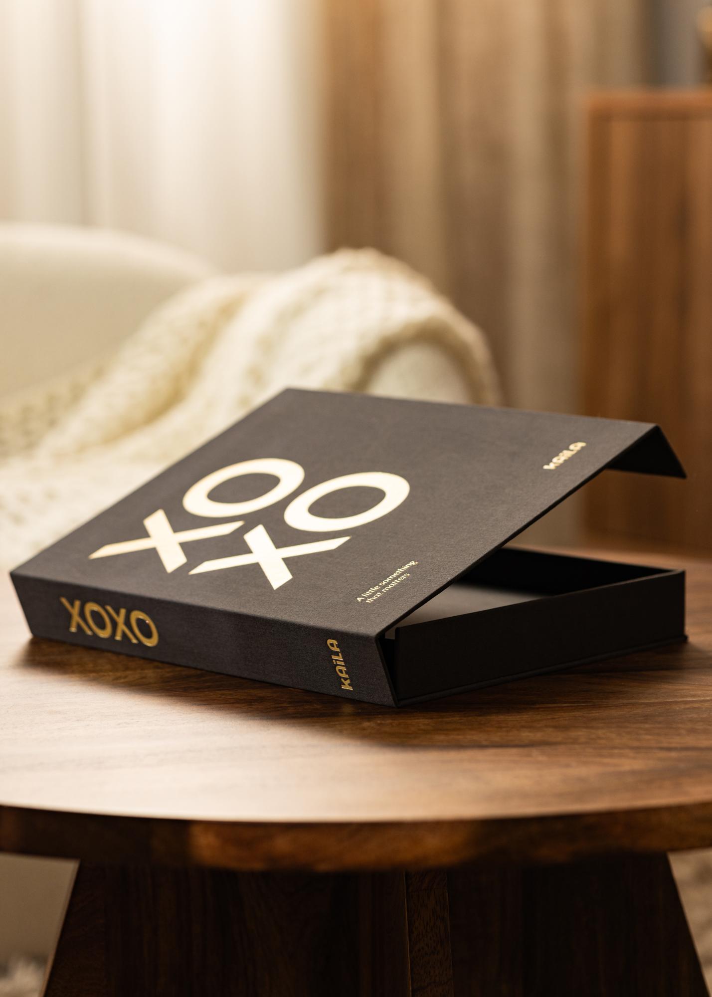 Acest album foto elegant este proiectat ca o carte de masă de cafea la modă și din acest motiv este numit și Album Foto pentru Masă de Cafea. Coperta este îmbrăcată elegant în material textil negru, iar pe fața și cotorul albumului se află o inscripție aurie cu salutul de rămas bun binecunoscut „XOXO” care înseamnă pupici și îmbrățișări. Acest titlu la modă este completat de asemenea cu un subtitlu care spune „A little something that matters” și este imprimat în colțul din stânga jos al albumului. Este un album foto foarte elegant, cu un design diferit și jucăuș care cu siguranță se va evidenția din mulțime.