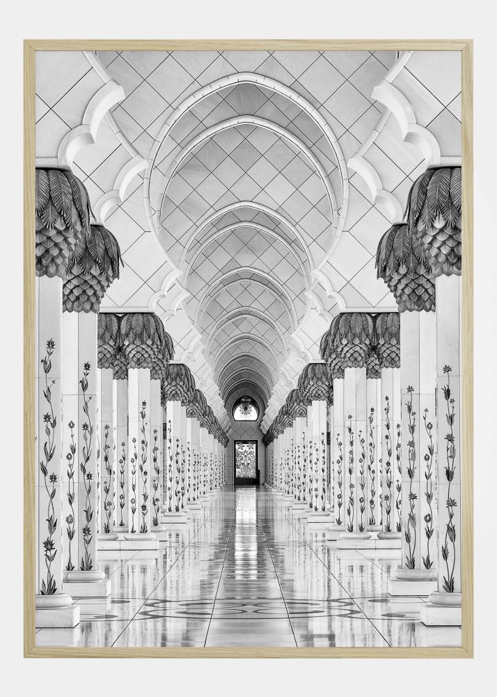 Un poster alb-negru care oferă o iluzie de adâncime. Două rânduri de coloane conduc spre o ușă de sticlă îndepărtată. Coloanele sunt frumos decorate cu flori. Lumina naturală pătrunde prin ușa de sticlă și creează o reflecție pe podea. Afișează acest print pentru a crea o senzație de spațiu suplimentar.