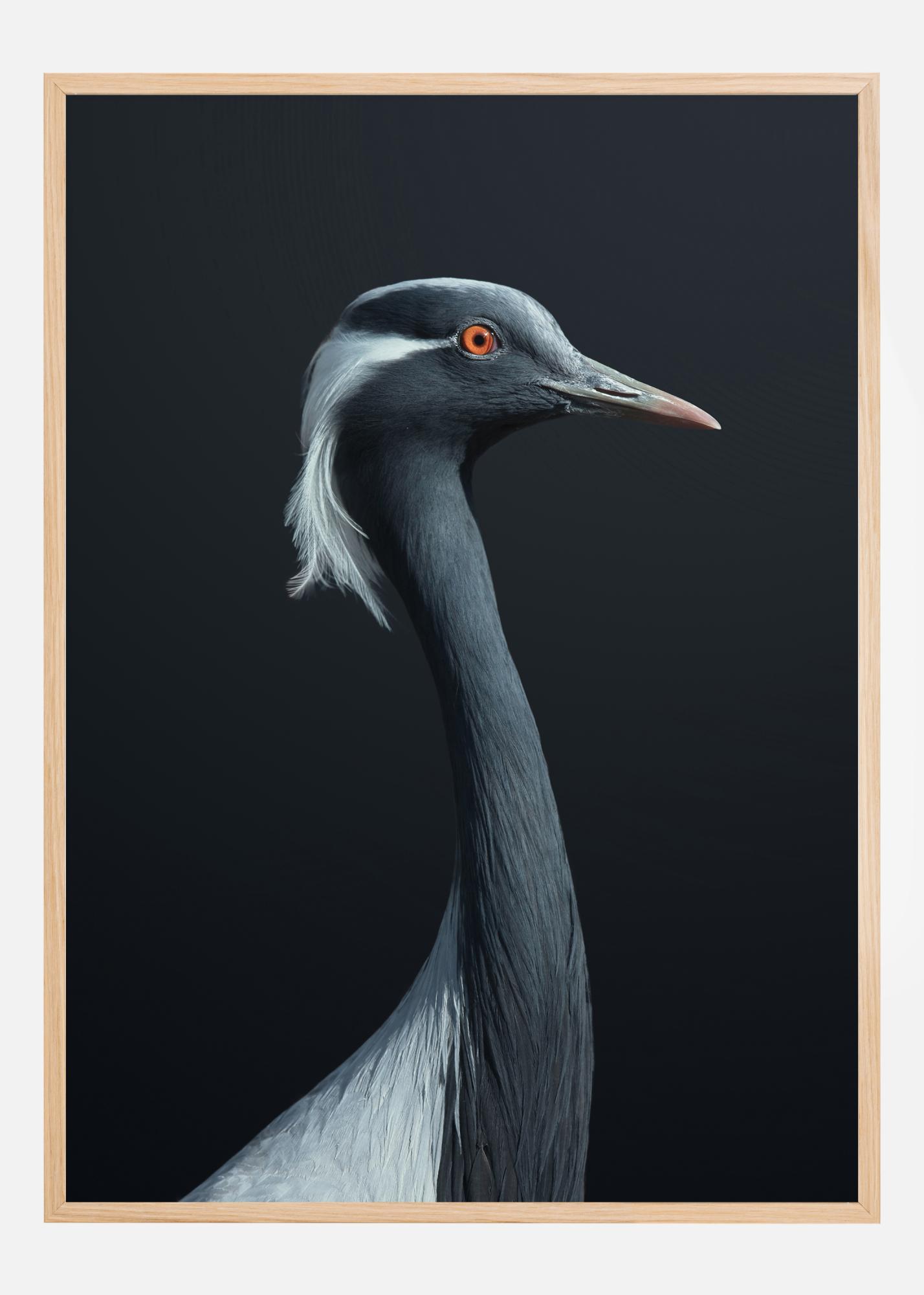 Un prim-plan al unei păsări alb-negru cu un gât lung. Frumoasele pene negre ale păsării duc către un corp alb care se potrivește cu creasta sa. O imagine impresionantă a unei păsări alb-negru pe un fundal gri, cu ochiul său portocaliu și negru care privește spre dreapta. O imagine perfectă pentru un iubitor de păsări.