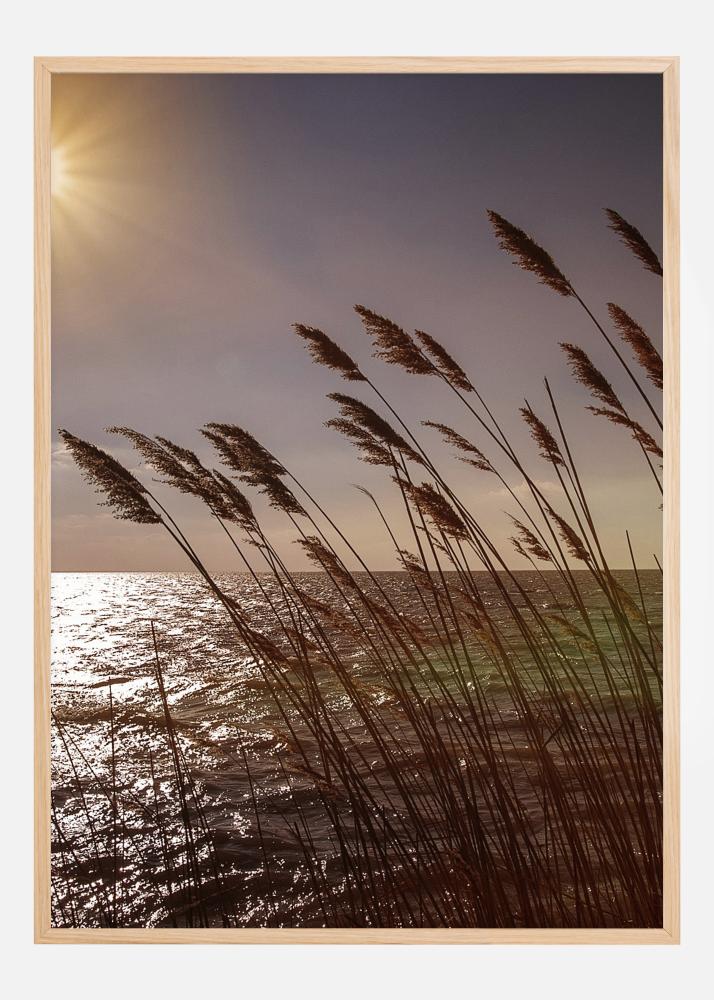 Un frumos poster al apusului de soare la malul apei. În timp ce razele soarelui se reflectă pe apă, iarba uscată flutură ușor în vânt. Nuanțele moi de portocaliu oferă o senzație de calm și liniște. Un element indispensabil pentru orice cameră din casă.