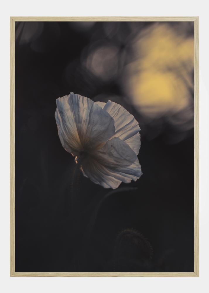 Acest poster captează esența unui amurg liniștit cu un singur mac în prim-plan, iluminat de ultimele raze ale unui apus de soare. Floarea este delicată și detaliată, petalele sale având o nuanță deschisă, aproape transparentă de alb și albastru deschis, care contrastează cu fundalul cald și neclar al apusului de soare în nuanțe de portocaliu și maro.