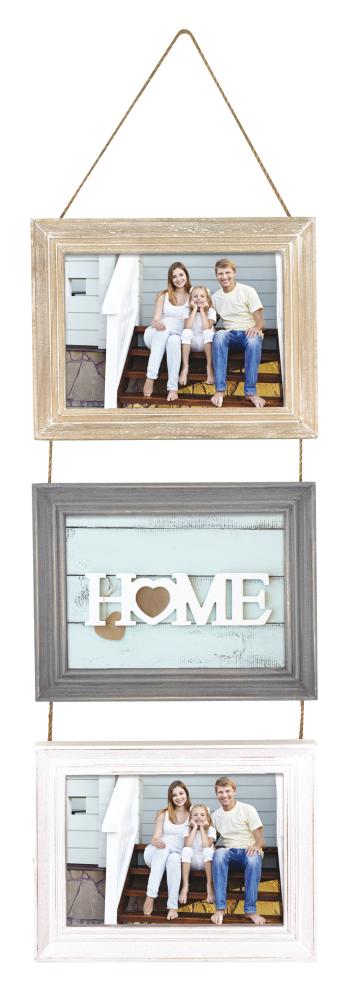 Umpleți casa cu fotografii înrămate ale celor dragi pentru o atmosferă caldă și confortabilă. Acest colaj rustic poate cuprinde trei dintre cele mai bune fotografii peisaj ale tale în format 10x15 cm. Ramele sunt de culoare lemn, gri și alb cu detalii uzate. Acestea sunt ținute împreună cu o frânghie decorativă, subțire, care este utilizată și pentru agățare ușoară.