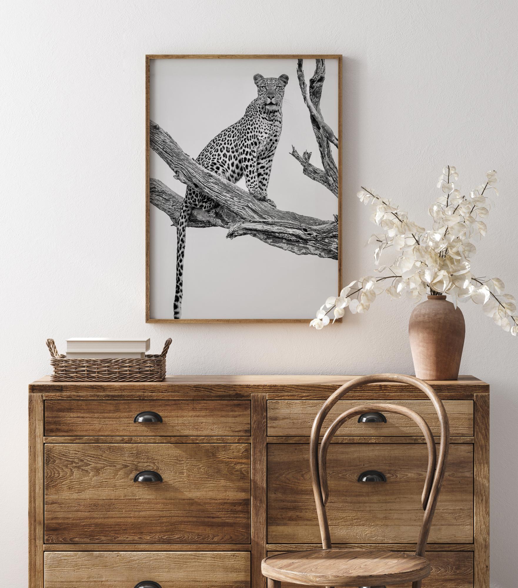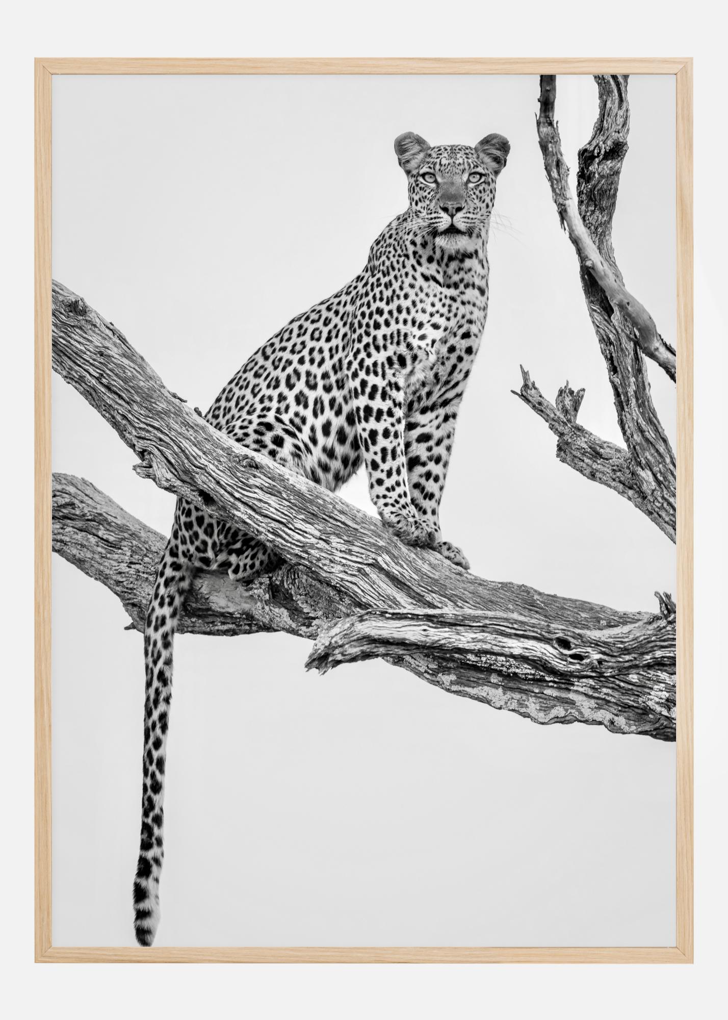 Un poster de natură cu un leopard care stă de pază pe o ramură de copac. Leopardul privește în depărtare și dă senzația că ceva urmează să se întâmple. Simte așteptarea cu acest poster.