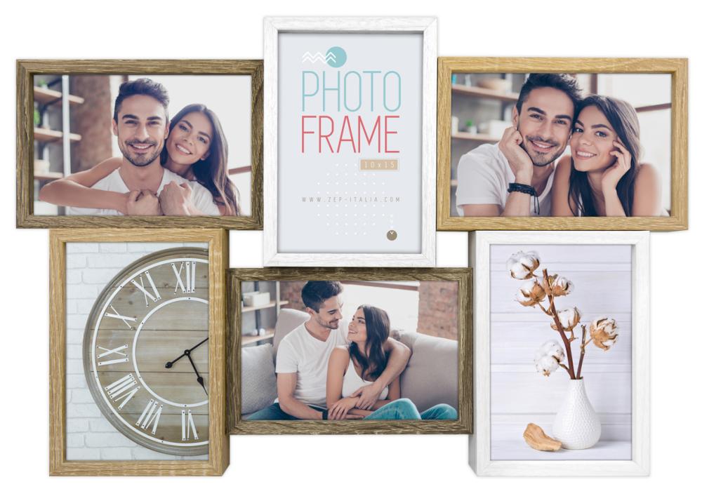 Ramă tip colaj elegantă, fabricată din lemn. Rama are mai multe nuanțe, dar păstrează un design stilat cu rame delicate în tonuri naturale. De ce nu aduni cele 6 amintiri foto cele mai frumoase și să le imortalizezi în această ramă pentru a le putea privi mereu înapoi! Această ramă colaj poate găzdui 6 imagini de dimensiunea 13x15 cm. Suport de perete inclus.