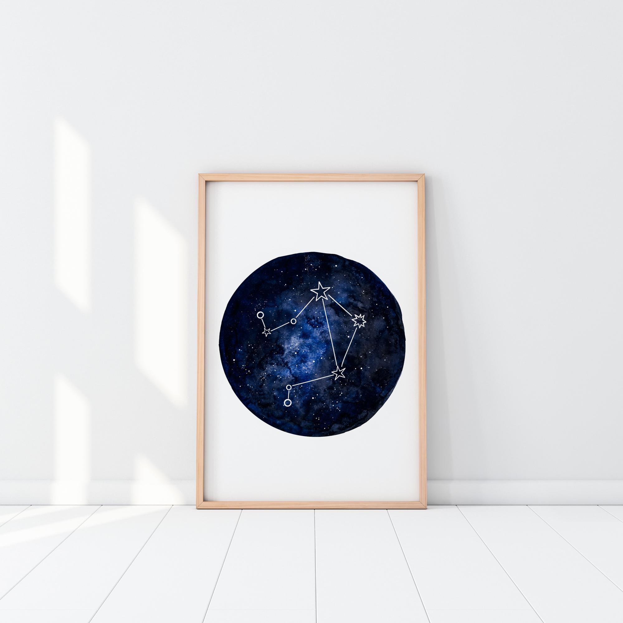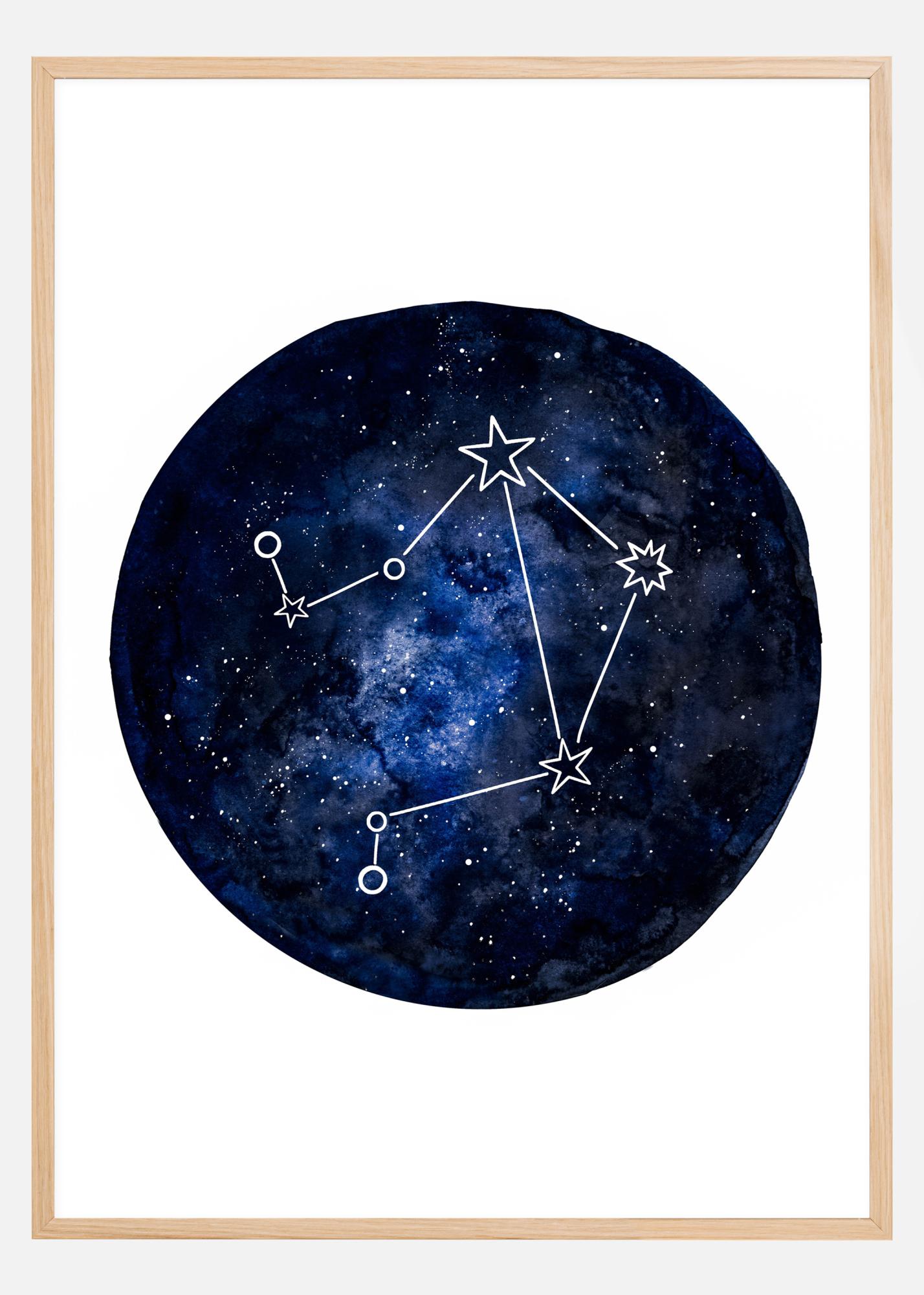 O hartă astrologică la scară mică a constelației Balanța. Harta de culoare albastru închis este plasată pe un fundal simplu alb și este evidențiată de linii albe care arată constelația Balanța. Un poster care este un cadou ideal pentru toți cei născuți sub acest semn zodiacal.