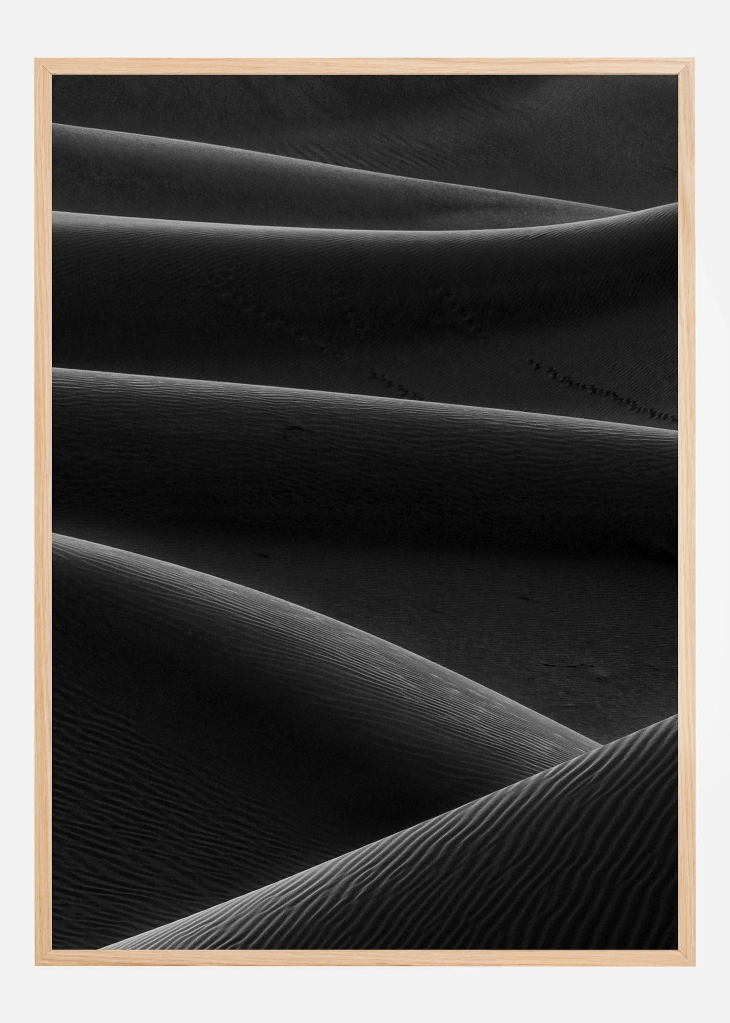 Un poster uimitor alb-negru cu dune de nisip în deșert. Nisipul unduitor este subliniat de lumina naturală care cade pe dune și creează un efect de margini. O imagine uimitoare dar liniștită de agățat pe un perete alb pentru a oferi o senzație de infinit.