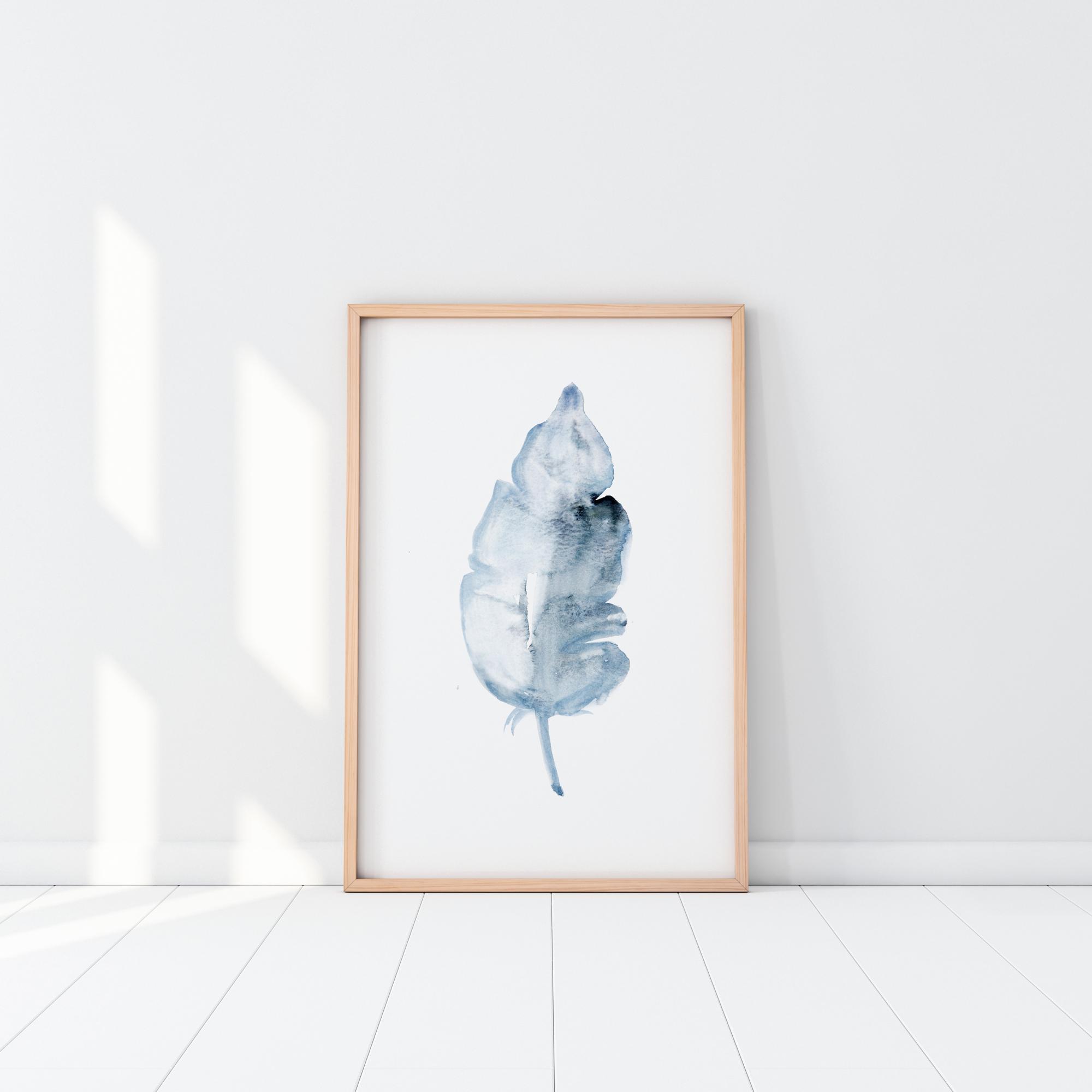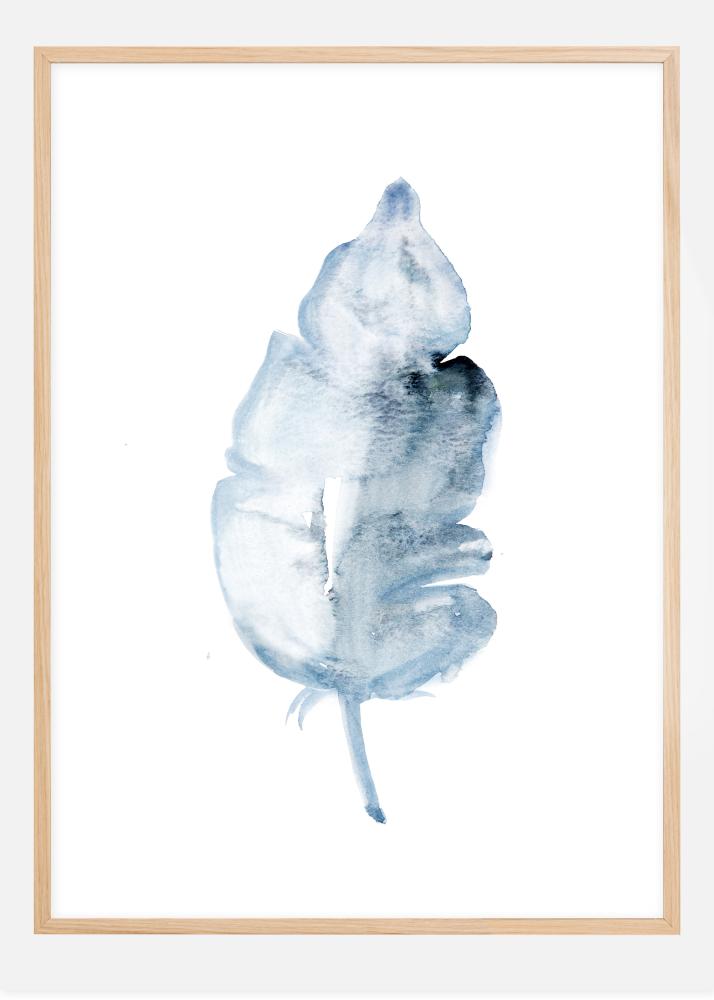 Un prim-plan frumos al unei pene mari de culoare albastru pal. Pe fundalul alb, lumina se reflectă pe partea stângă a penei și creează un aspect aproape transparent. Un poster minimalist care se potrivește perfect în orice mediu.