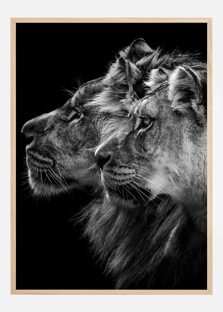 Un imprimeu captivant alb-negru cu un leu și o leoaică. Pe fundalul negru, aceste creaturi magnifice au o expresie de concentrare. Lumina naturală luminează liniile maxilarului animalelor, făcându-le să pară și mai dominante. Un poster perfect pentru toți iubitorii de animale.
