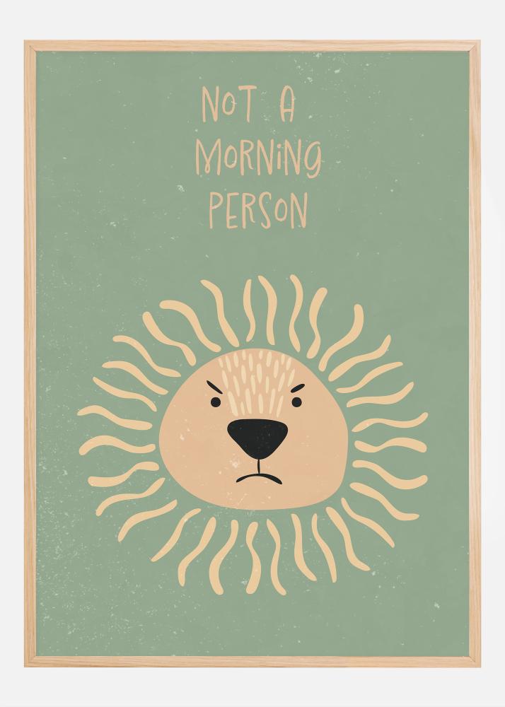 Cu o expresie jucăușă și un mesaj fermecător, acest poster este un detaliu decorativ amuzant pentru toți cei care nu sunt tocmai oameni de dimineață. Ilustrația înfățișează un leu drăguț cu o coafură care seamănă cu razele soarelui, însoțit de textul "NOT A MORNING PERSON" într-un stil relaxat și scris manual. Nuanța verde atenuată a fundalului oferă un efect liniștitor, în timp ce tonurile calde de galben și bej ale leului creează o senzație moale și primitoare.