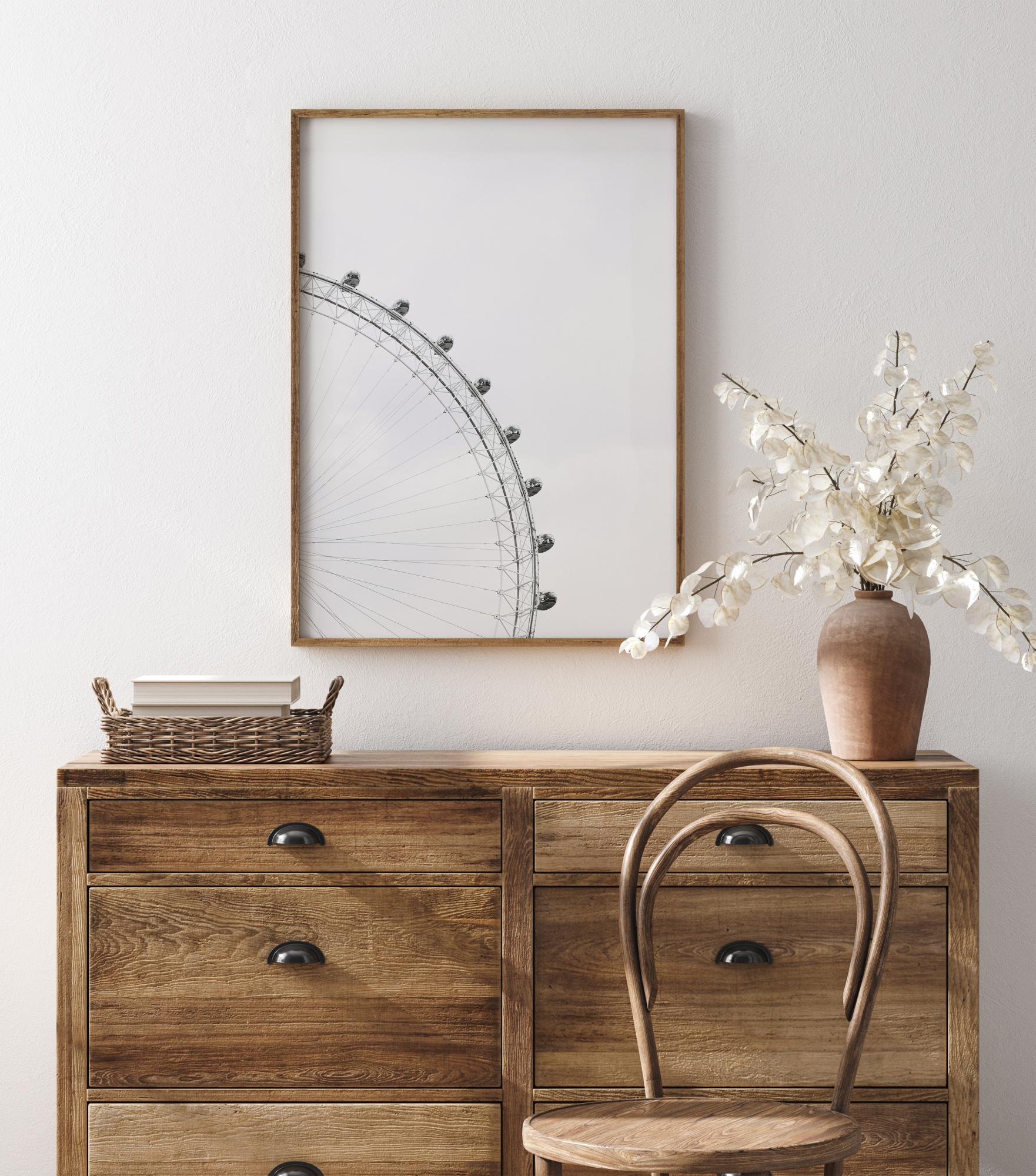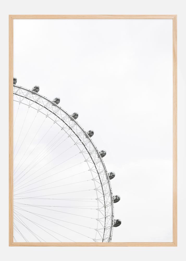 Un imprimeu impresionant alb-negru al London Eye. Cu cerul gri al Londrei pe fundal, spițele roții îndreaptă privirea către cele nouă cabine de pasageri. Un poster cu adevărat impresionant care evidențiază această magnifică construcție tehnică. Imaginează-ți priveliștea dintr-una dintre aceste cabine.