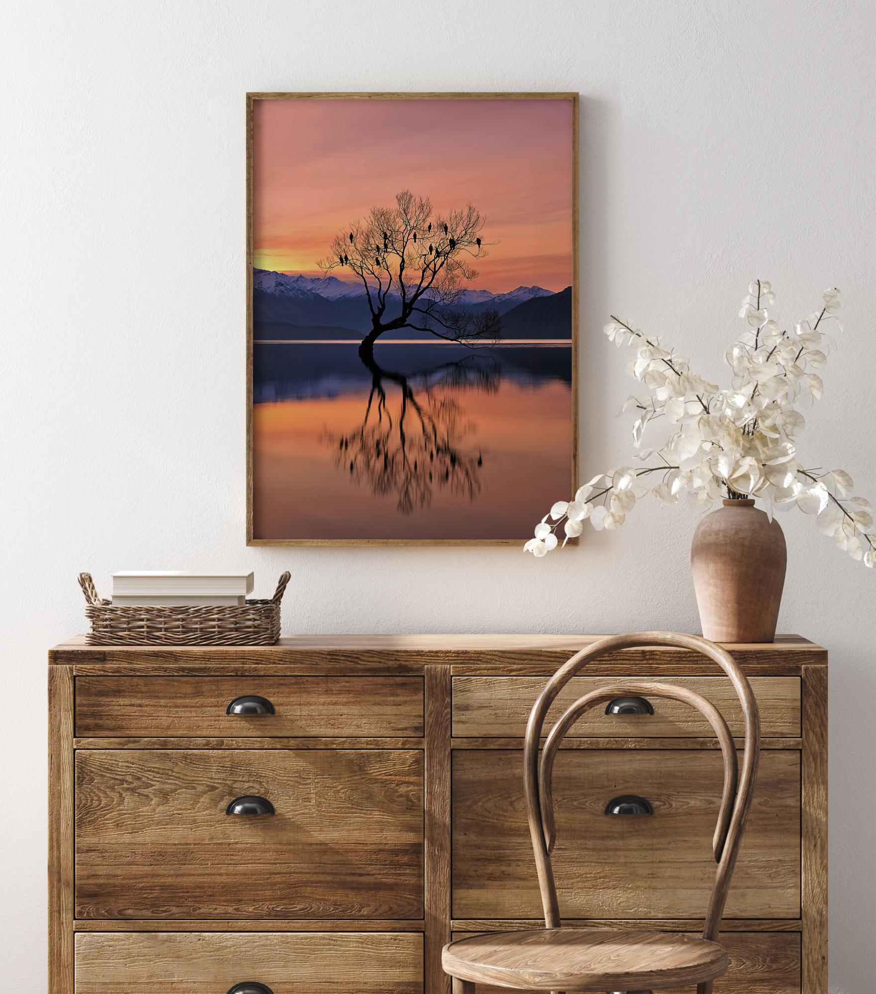 Un poster frumos cu natură ce prezintă un copac singuratic în mijlocul unui lac. Cu păsări care stau liniștite pe ramuri, această imprimare în culori pastel reflectă copacul în lac și creează un efect de oglindă perfect al atât al naturii cât și al culorilor. Ascultă tăcerea în această imagine liniștitoare.