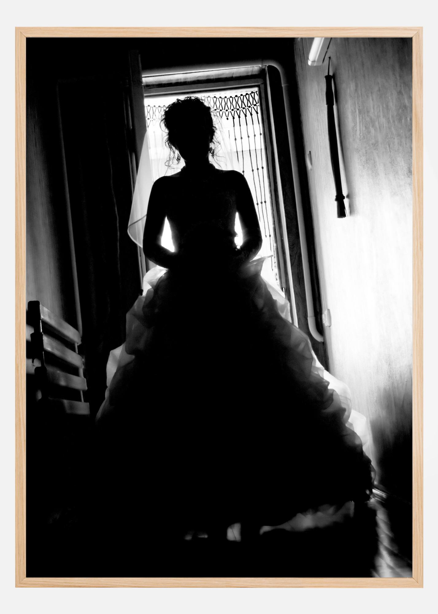 Artă fotografică în scară gri închis a unei mirese fotografiate în contralumina. Un poster întunecat și difuz care creează interes și curiozitate. Combinați cu alte favorite pentru un perete de tablouri mai mare și mai vibrant.