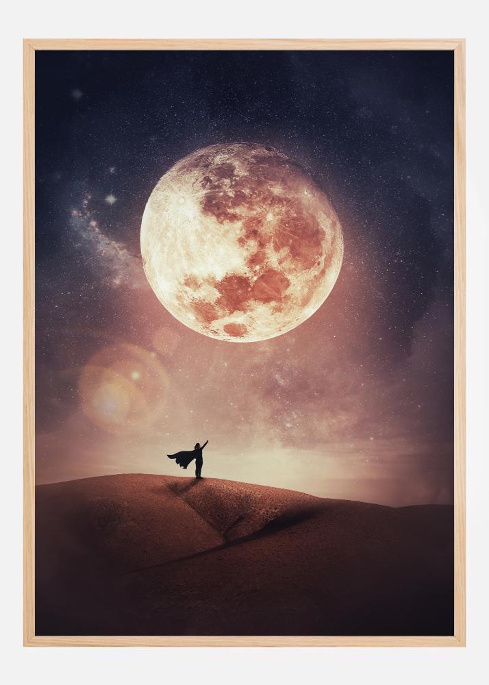 Afișul de vis captează un moment magic în care o figură solitară stă pe o colină deșertică și privește spre o lună enormă și strălucitoare, înconjurată de un cer înstelat. Scena este un memento puternic al locului nostru în univers, atât nesemnificativ cât și minunat. Ea trezește sentimente de dor și curiozitate, ne inspiră să gândim măreț și să visăm fără limite.