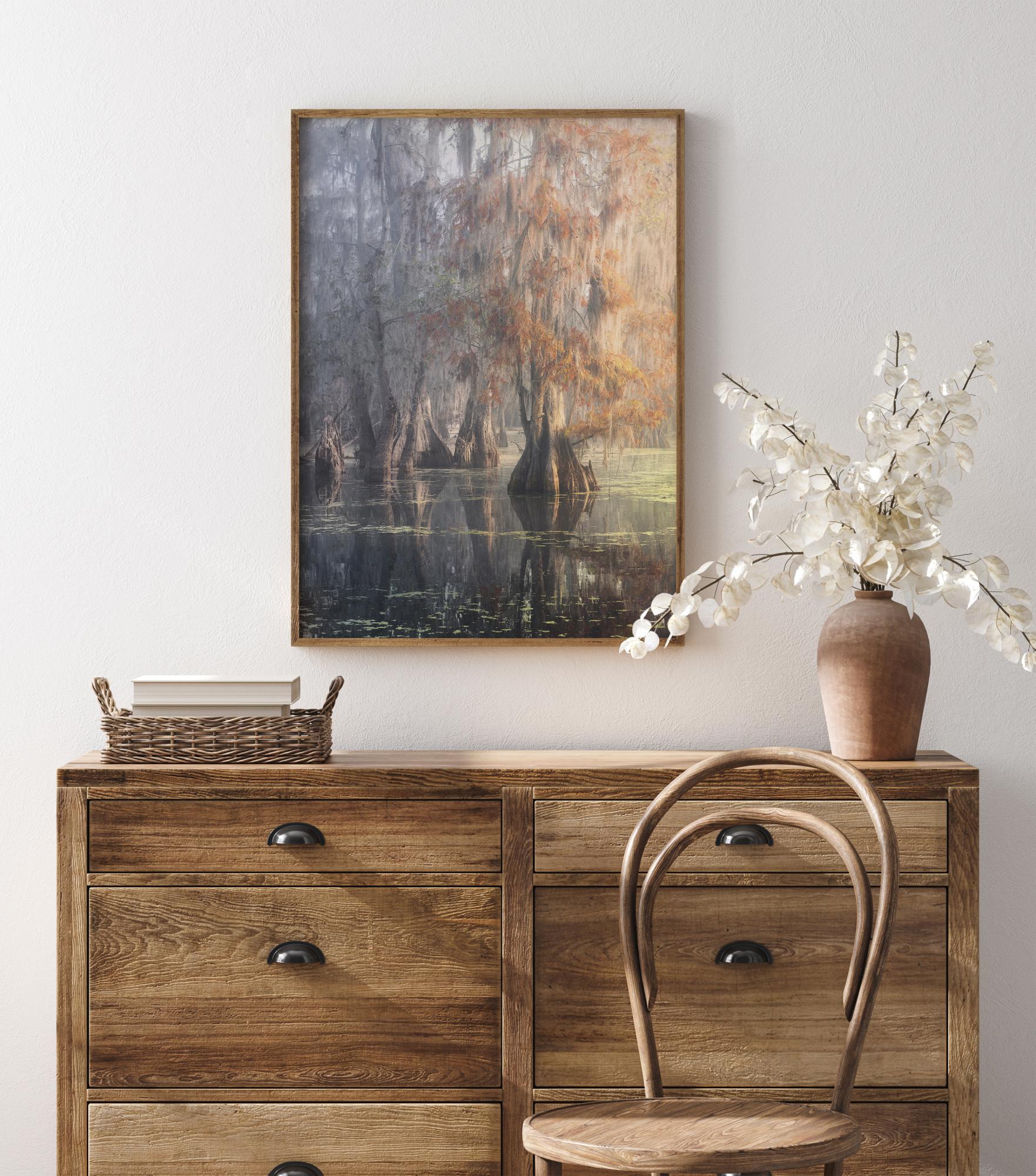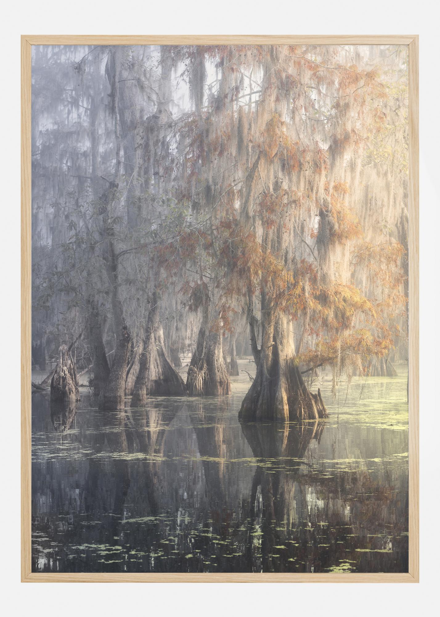 Un poster uluitor de frumos cu o mlaștină din Louisiana. O imagine excepțional de liniștită a unei mlaștini cu apă calmă. Lumina naturală aruncă reflexii perfecte în mlaștină și creează un sentiment de liniște. Aduceți natura în casa dumneavoastră cu frumoasele nuanțe de verde și maro din această imprimare.