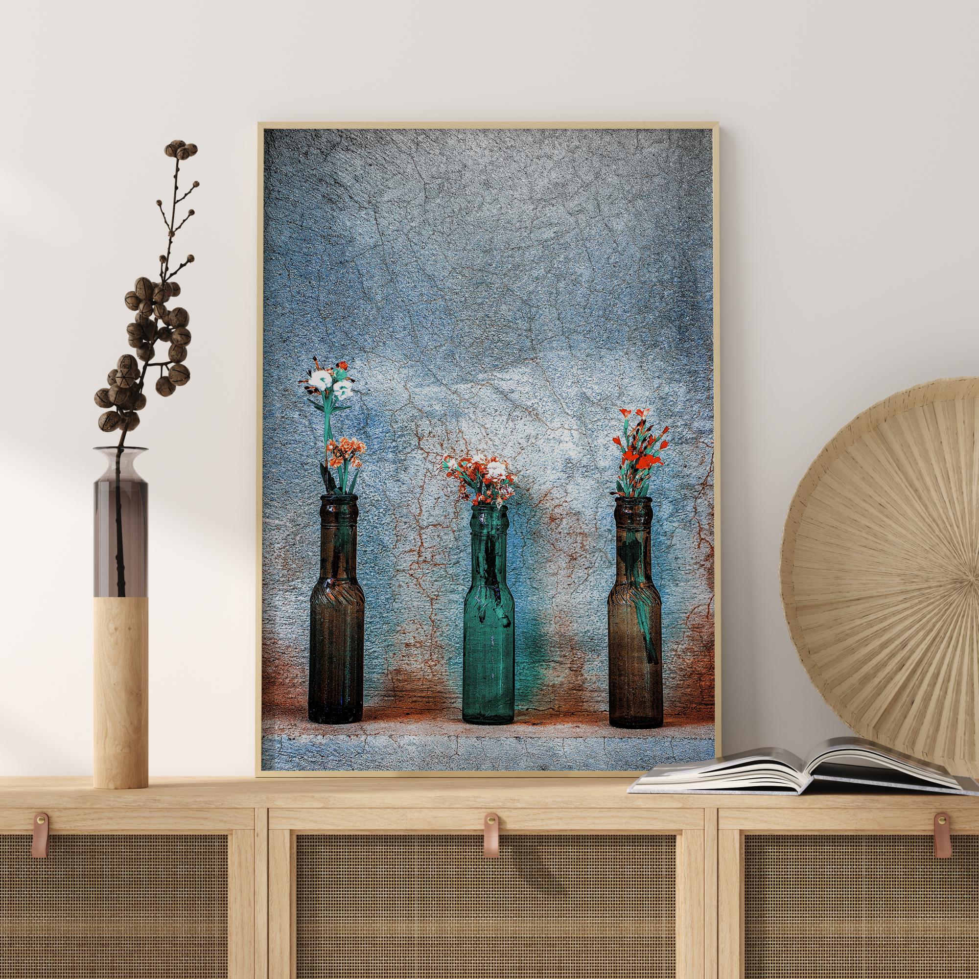 Un imprimeu frumos cu trei sticle de sticlă pe o suprafață de piatră. Fiecare sticlă conține mici buchete colorate de flori colorate. Venele maronii din pietre accentuează umbrele maronii ale sticlelor care se reflectă pe raftul de piatră. Un poster simplu, dar delicat, de agățat pe un perete alb pentru a adăuga puțină culoare în plus.