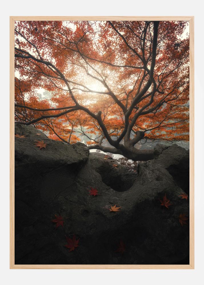 Un poster de natură uluitor cu un frumos copac de arțar portocaliu. Fotografia dintr-o perspectivă de jos arată lumina puternică a soarelui care strălucește prin crengi, creând o senzație caldă și relaxantă. În prim-plan, câteva frunze roșii și portocalii au căzut pe un trunchi. Adaugă o notă de natură în casa ta cu acest print.