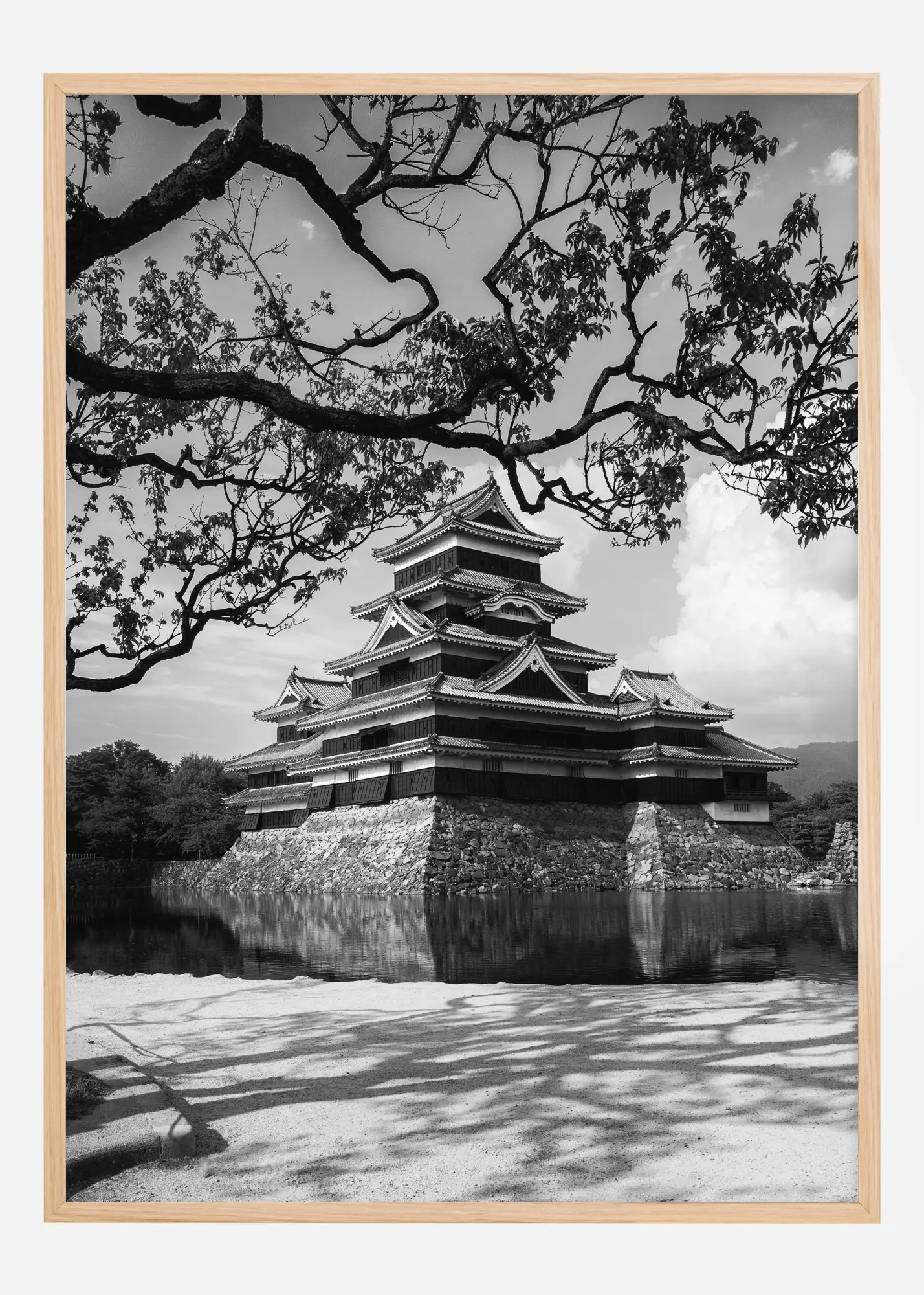 Experimentați o bucată din bogata istorie a Japoniei cu acest poster captivant care înfățișează Castelul Matsumoto, unul dintre cele mai renumite castele de samurai ale țării. Fotografia alb-negru evidențiază trăsăturile arhitecturale detaliate și cele mai vii contraste, de la marginile proeminente ale acoperișurilor izbitoare până la textura robustă a fundației de piatră. Ramurile unui copac răspândit suprapun cerul și oferă un cadru natural imaginii, accentuând sentimentul tradițional.