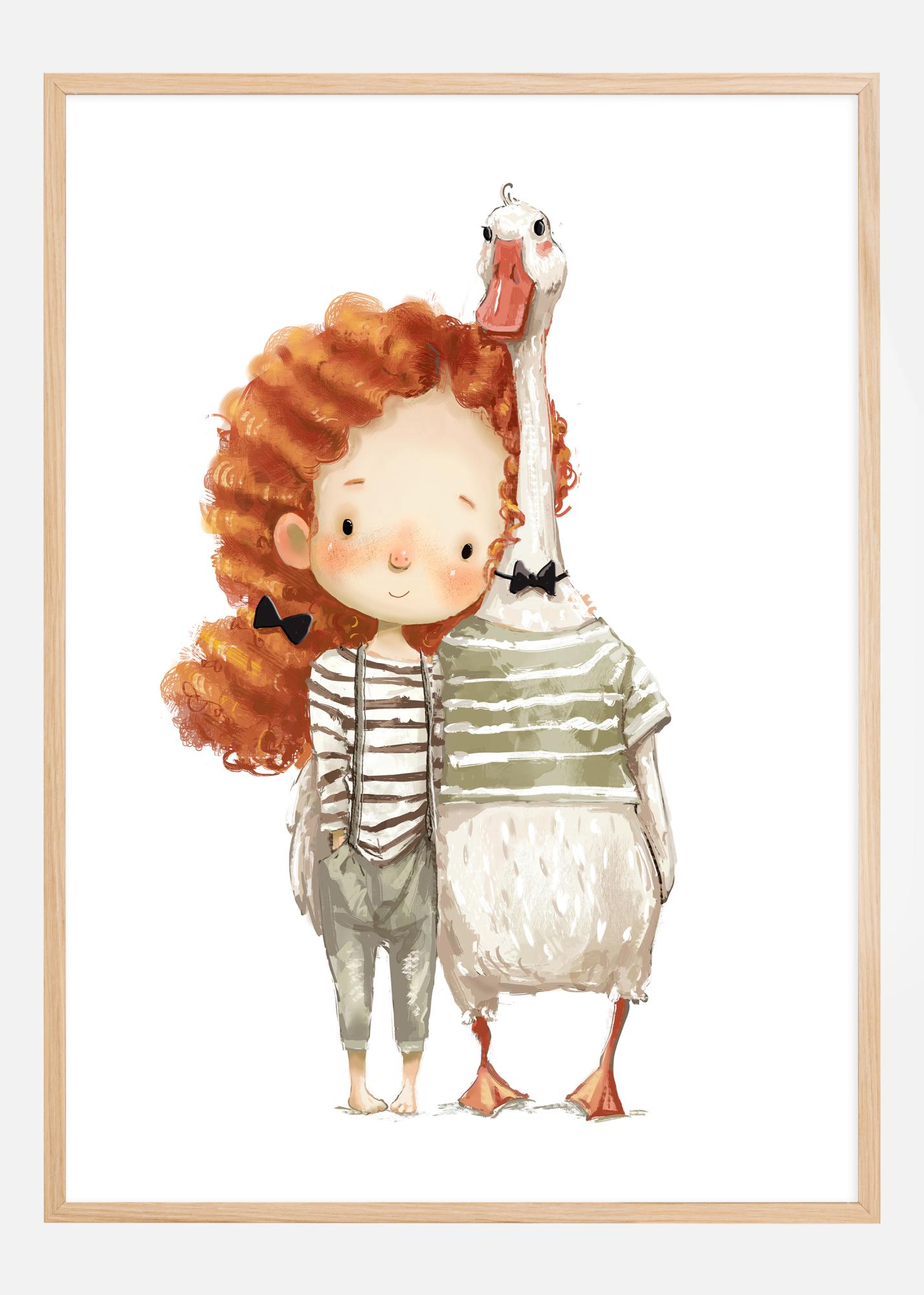 Acest poster jucăuș și înduioșător înfățișează o fetiță cu părul roșu și ondulat, stând lângă însoțitorul ei de încredere, o rață mare. Ei împărtășesc un moment tandru și fericit împreună, capturat în tonurile moi și calde ale picturii în acuarelă. Duo-ul fermecător, cu obrajii rozalii ai fetiței și privirea curioasă a raței, emană prietenie și bucurie.