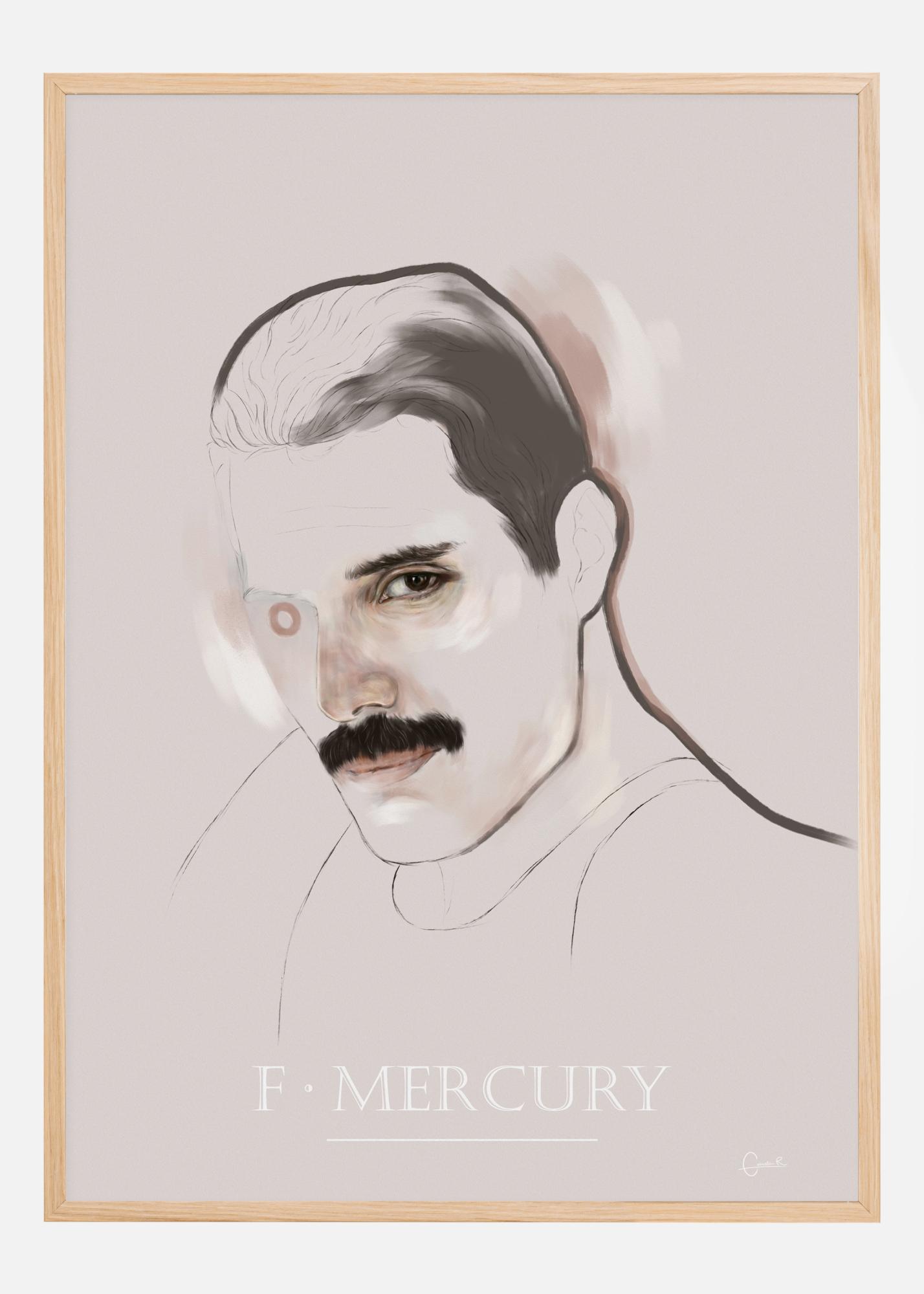 Un portret impresionant al lui Freddie Mercury pe un fundal roz deschis. Ochiul său stâng îți atrage privirea, în timp ce ochiul său drept este înlocuit cu un inel. Mustața sa îndrăzneață neagră și părul său negru intens sunt trăsăturile principale ale acestui poster izbitor. Linii puternice conturează capul și umerii săi. Ascultă muzica când atârni acest portret în casa ta.