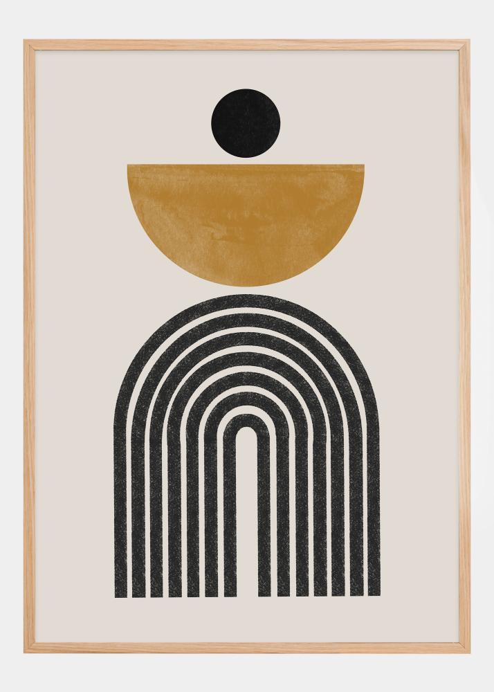 Adâncește-te într-o lume a abstractului și simetriei cu posterul nostru modern care prezintă o serie de arcuri alb-negru sub o semilună aurie în formă de soare, acoperită de un cerc negru. Acest print este un omagiu adus clarității artei moderne și simplității designului geometric, oferind o notă sofisticată decorului tău. Culorile sunt îndrăzneț reduse pentru a evidenția contrastul și greutatea vizuală a fiecărei forme.