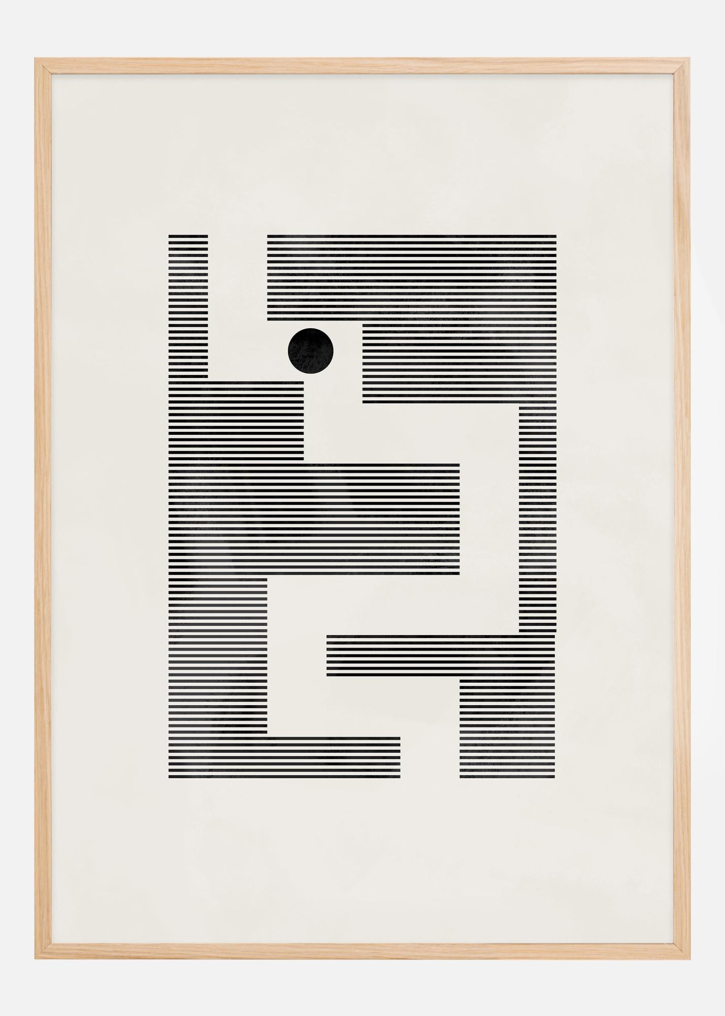 Această afiș artistic oferă o interpretare minimalistă a unui labirint, realizat cu linii negre care formează o țesătură complicată de forme geometrice pe un fundal de culoare crem. Cercul negru solitar plasat în centrul labirintului funcționează ca un punct de ancorare vizuală, oferind în același timp o adâncime și un punct de focalizare motivului altfel simplu. Acest design se joacă cu privirea observatorului și încurajează o explorare vizuală a căilor și fundăturilor sale.