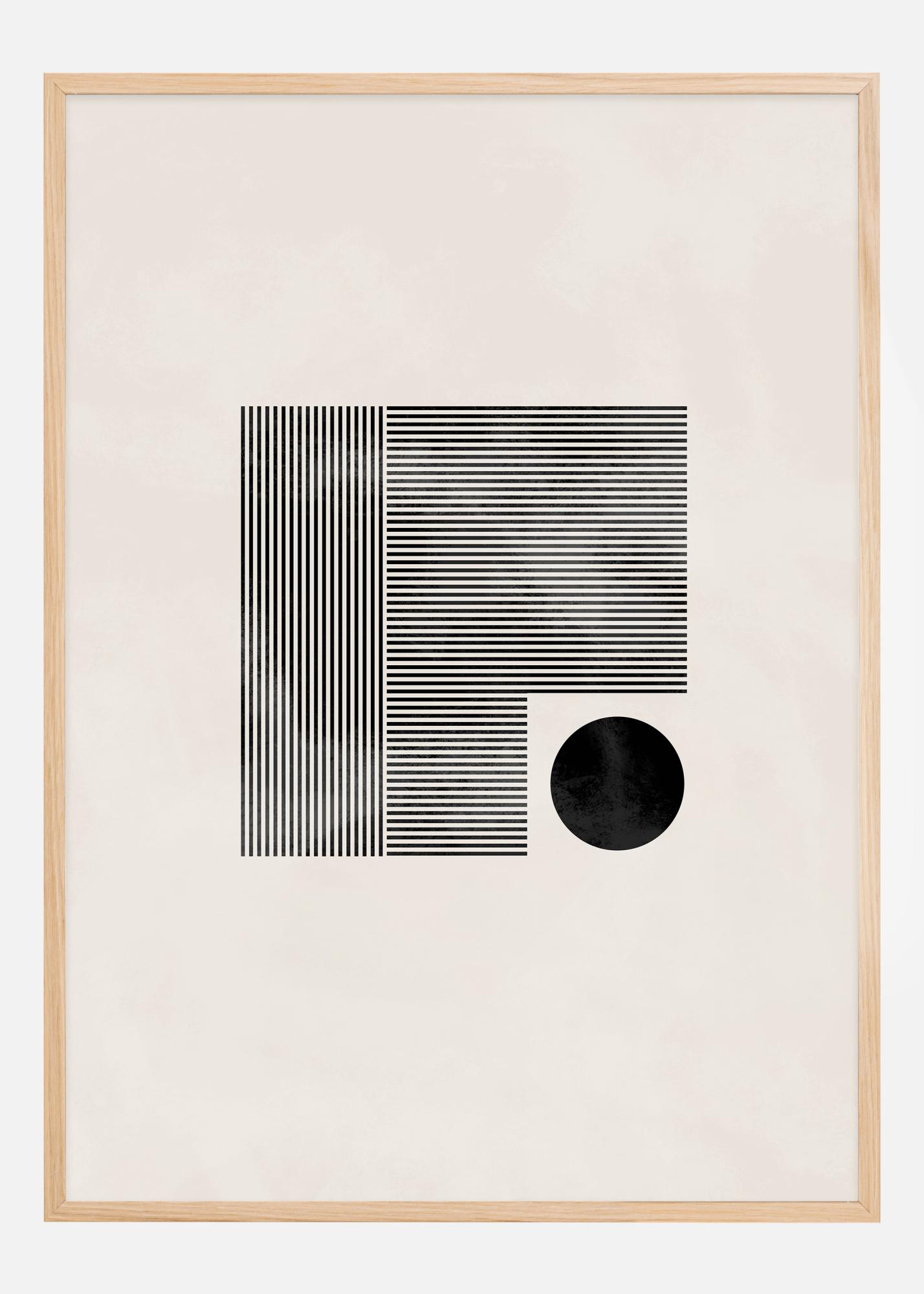 Această afiș minimalist și elegant prezintă un joc geometric între dreptunghiuri și un cerc, toate redate în linii și forme negre îndrăznețe pe un fundal moale, de culoarea cremei. Compoziția strictă a liniilor din dreptunghiuri oferă un sentiment de ordine și structură, în timp ce cercul negru solitar iese în evidență și introduce o neregularitate care creează interes vizual și echilibru. Aceasta este o operă de artă care poate fi apreciată pentru simplitatea și capacitatea sa de a completa o varietate de stiluri de interior.
