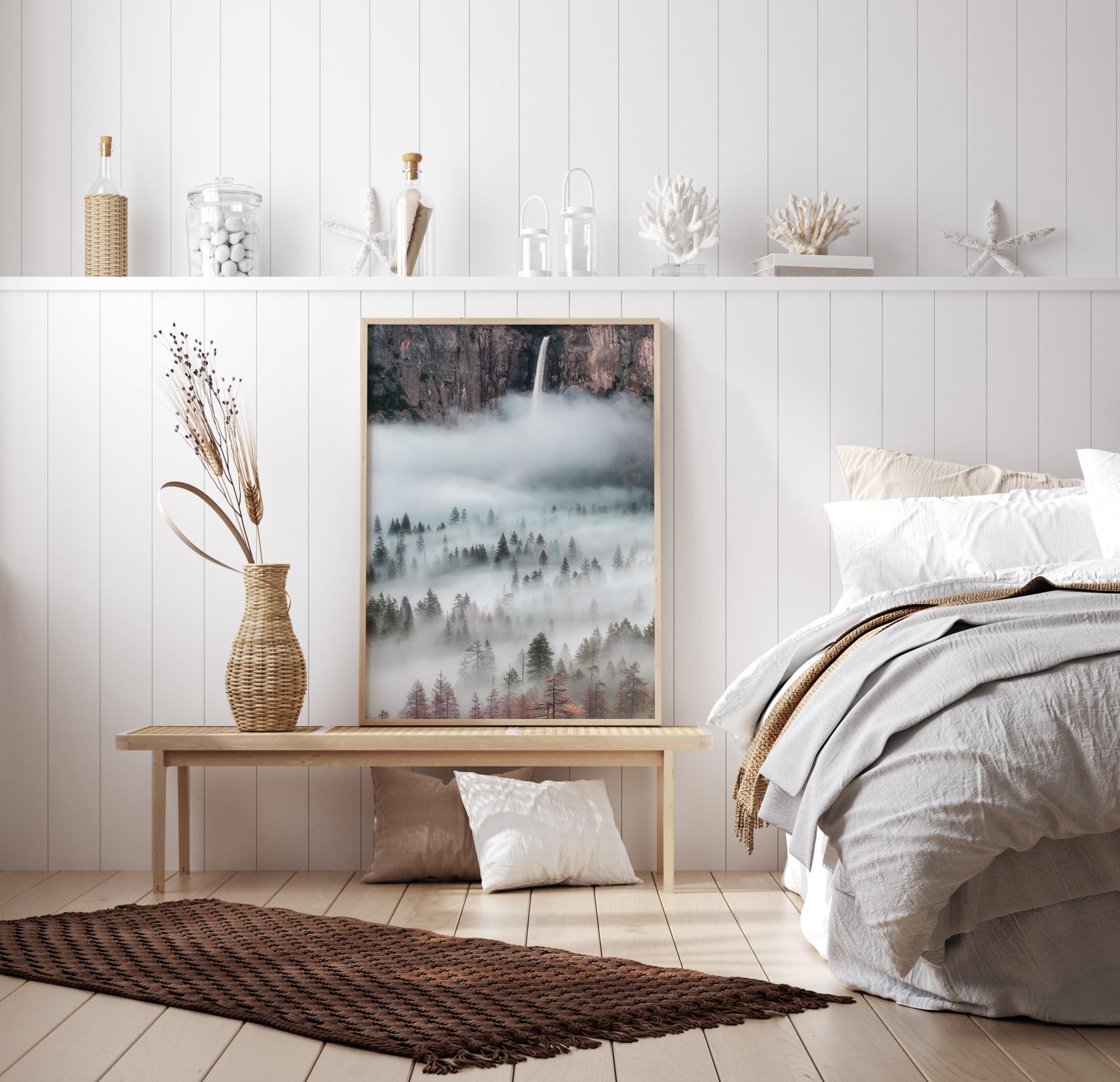O fotografie minunată a unui versant de munte cețos cu câteva pietre și o cascadă spectaculoasă în fundal. Ceața norilor plutește liniștit și oferă o senzație de dimineață răcoroasă care împodobește casa ta. Culorile minunate de toamnă și ceața plutitoare oferă o senzație de mister.
