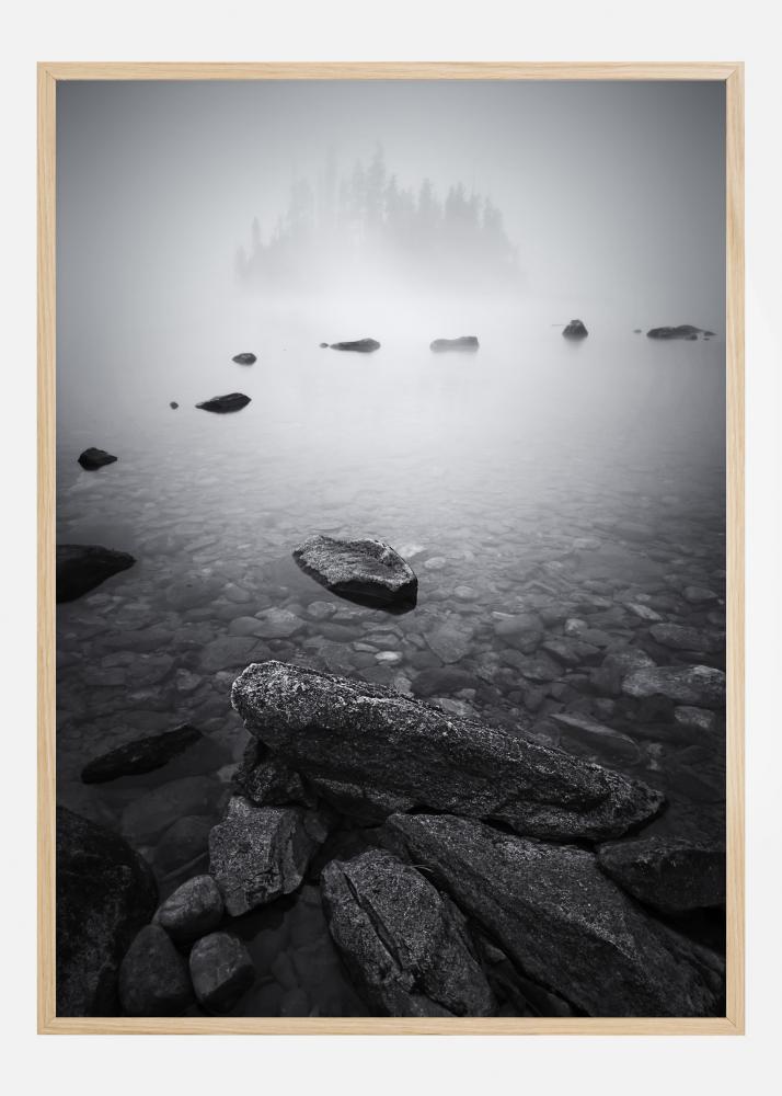Un poster misterios cu natură, cu pietre și un lac cu ceață. Imaginează-ți ce se află acolo când privești insula acoperită de copaci învăluiți în ceață. Fă-ți casa magică cu acest print fantastic pe un perete albastru.
