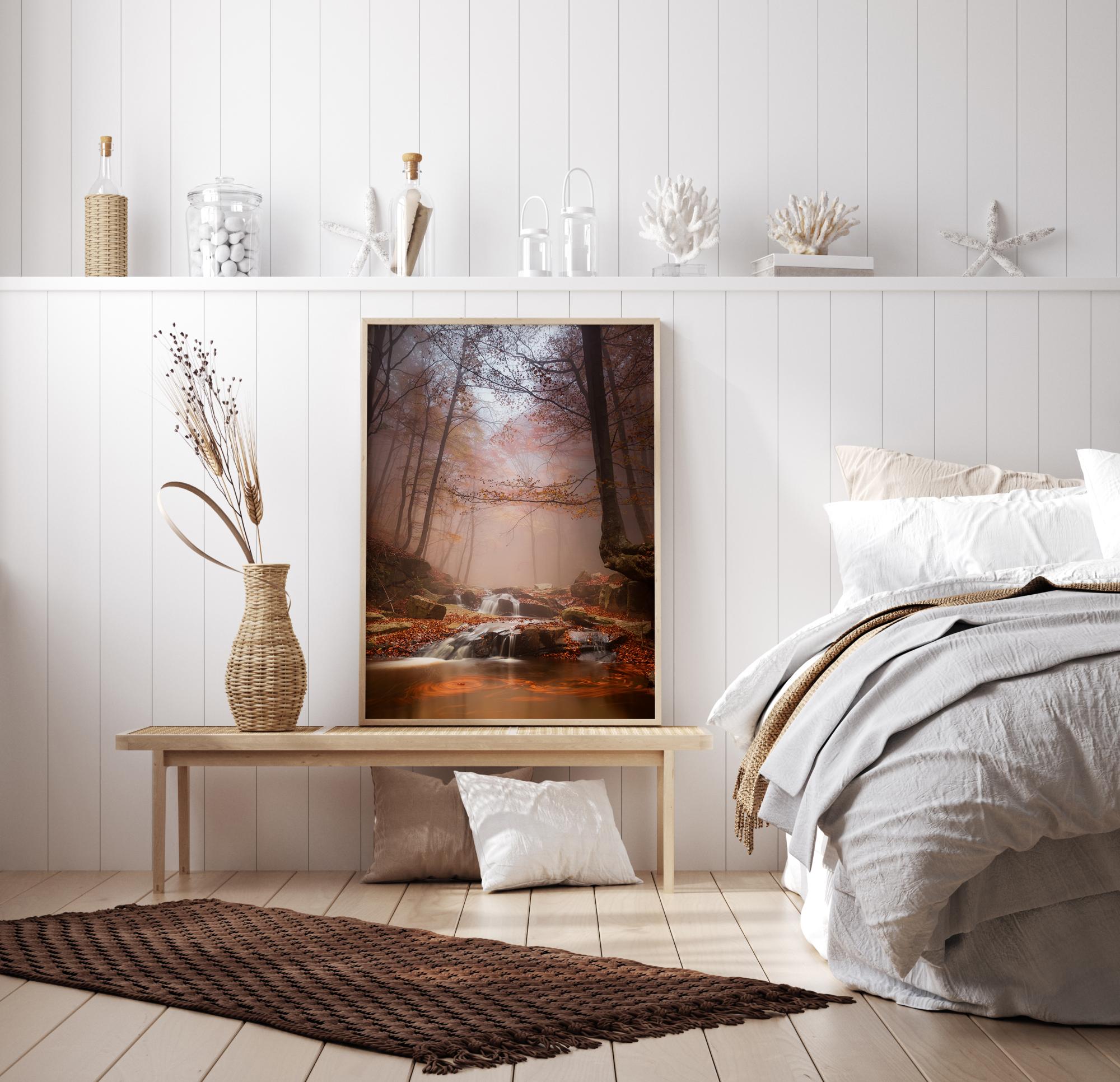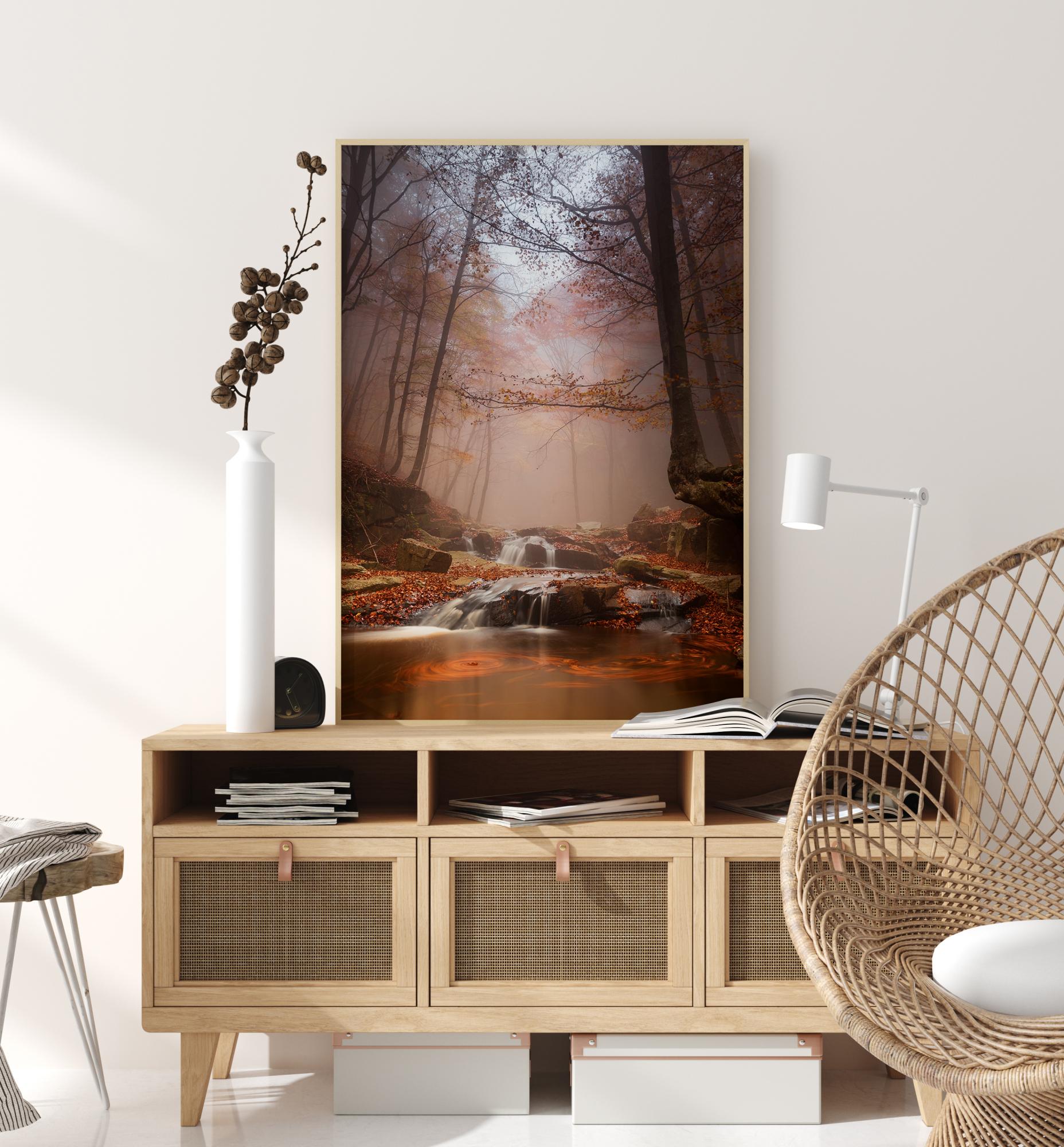 Un portret pitoresc al unei păduri învăluite în ceață, cu un pârâu frumos. Ceața blochează lumina directă a soarelui și doar anumite raze iluminează pădurea încețoșată, evidențiind frunzele maro și galbene. În prim-plan se află frunze în culoarea toamnei pe malul râului. Acest poster este gata să ofere casei tale o vedere pitorească și stâncoasă, cu denivelări ale unei păduri.