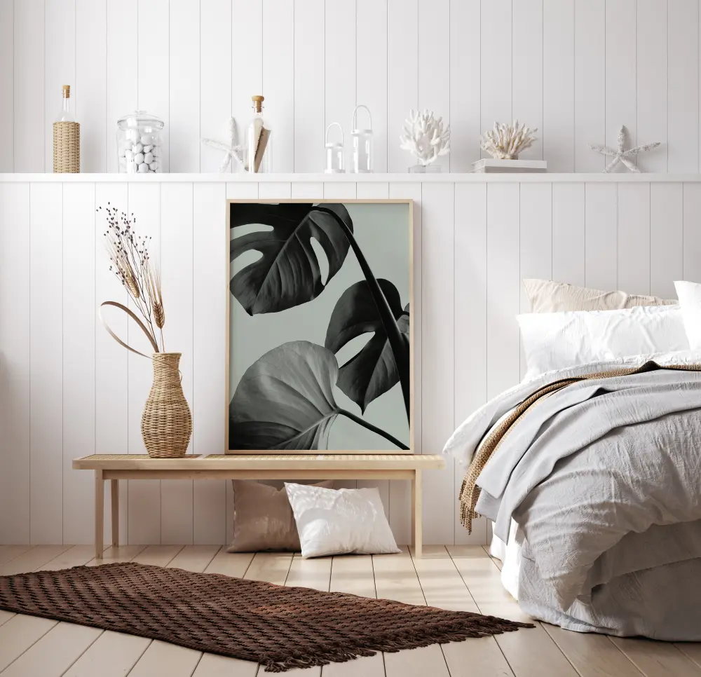 Un poster incredibil alb-negru de prim-plan cu trei frunze de monstera care, cu forma lor de inimă, se întind peste fundalul gri mat. Frunzele în formă de fierăstrău au forme asemănătoare ochilor care le conferă o senzație perfectă de sălbăticie. Oferă locuinței tale o senzație captivantă, deoarece formele asemănătoare ochilor sunt puțin înfricoșătoare.