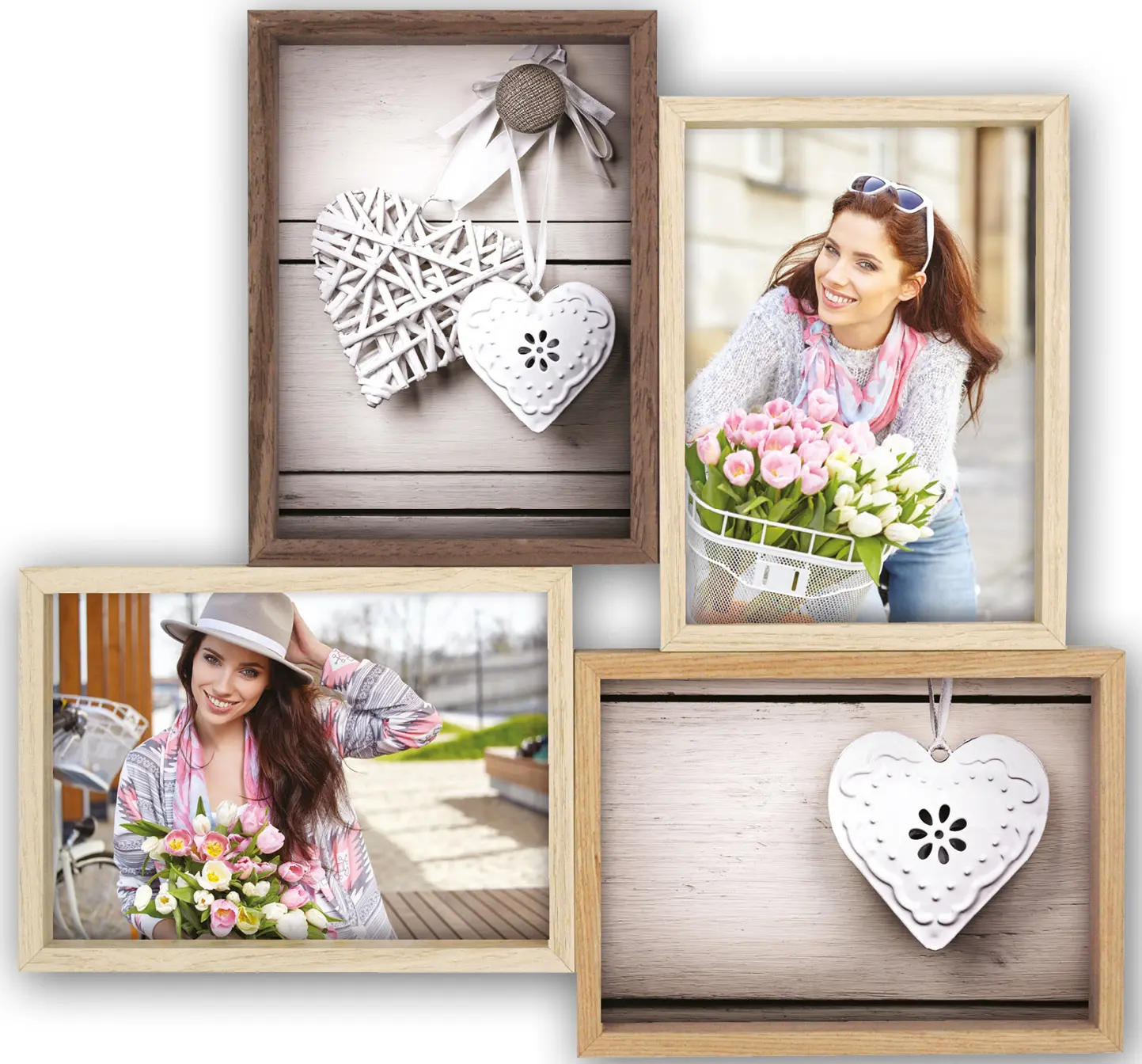 Cadru frumos colaj din lemn cu patru rame în nuanțe diferite. Acest cadru are spațiu pentru 4 imagini de dimensiune 13x18 cm. Acest cadru are un aspect foarte elegant, ceea ce îl face potrivit în multe case și ușor de asortat cu alte tablouri și decorațiuni de perete pe peretele tău. Dimensiunile exterioare ale cadrului măsoară 39,5x37,5 cm. Suport de perete inclus.