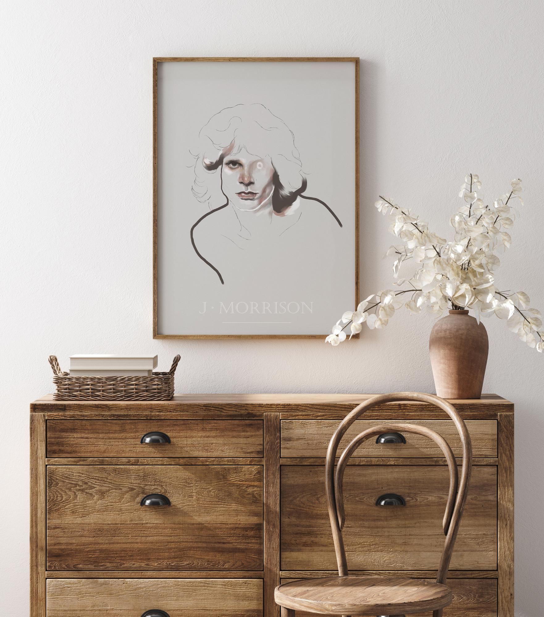 Un poster frumos cu Jim Morrison. Pe un fundal bej, capul și umerii artistului au fost desenate cu un creion negru, în timp ce gura a fost conturată cu maro. Ochiul stâng este fără pleoape. Un afiș perfect pentru toți cei care iubesc muzica.