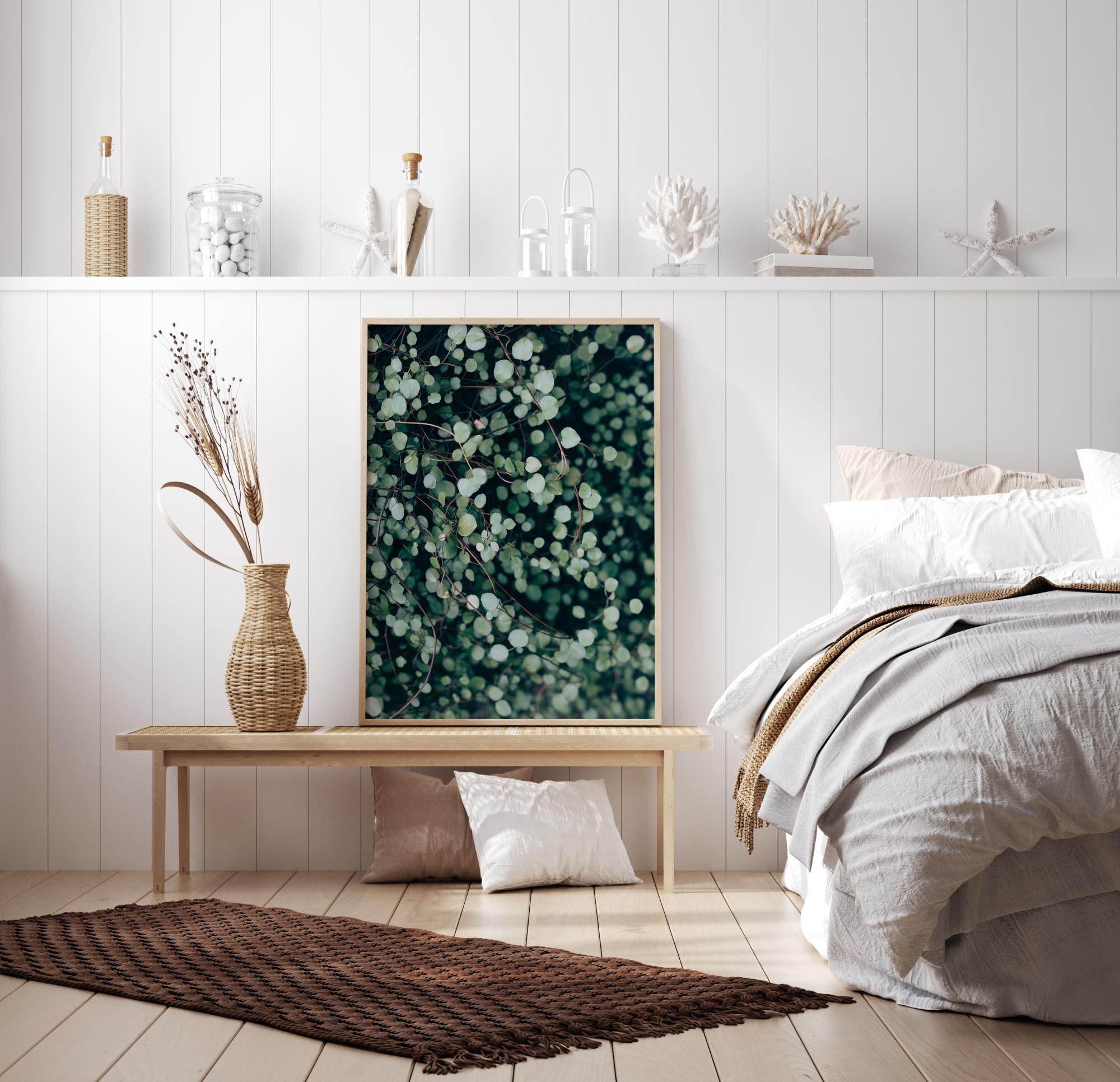 Un frumos poster cu prim-plan verde, cu o plantă cu șarpe cu multe frunze și ramuri. Frunzele mici, rotunde, strălucesc fericit în lumina soarelui. Fundalul negru face ca frunzele să iasă în evidență și mai mult. Atârnă această imprimare pe un perete verde deschis pentru a aduce o notă liniștitoare într-o cameră.