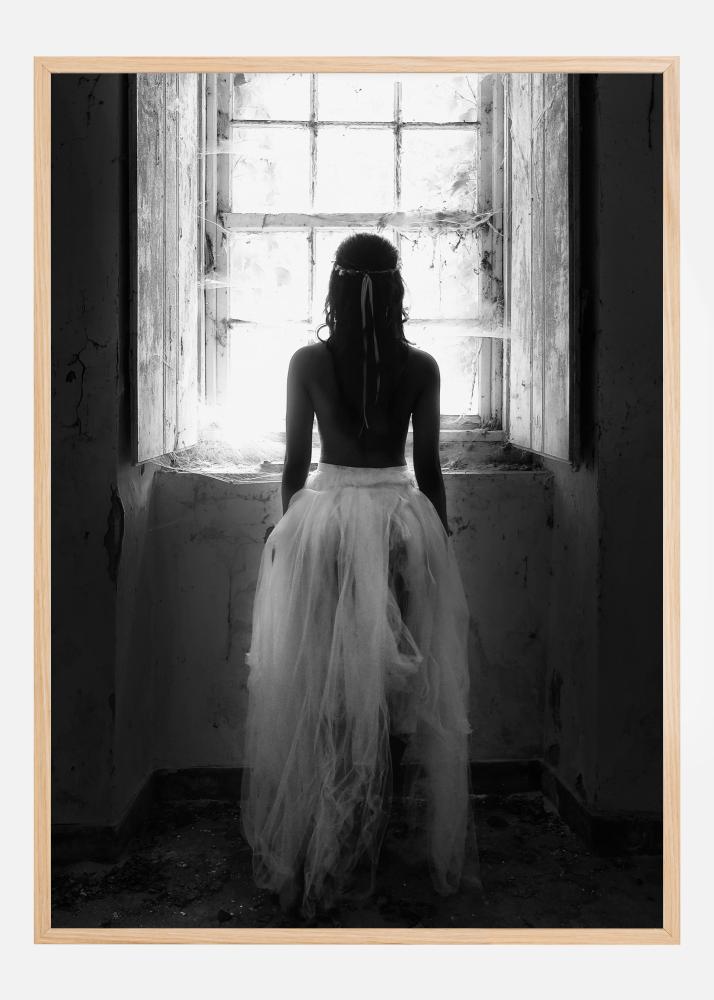 O fotografie frumoasă în alb-negru a unei femei pe jumătate dezbrăcate care stă lângă o fereastră veche. Fereastra murdară este acoperită de pânze de păianjen și femeia privește afară prin fereastră. Îmbrăcată într-o fustă de tul alb, tânăra femeie pare adânc cufundată în gânduri. Un poster perfect de agățat într-un dormitor.