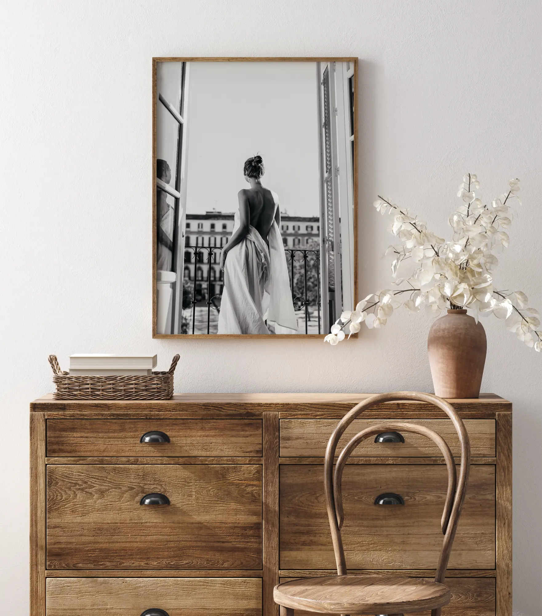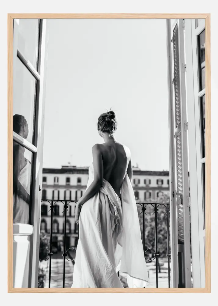 Un poster sexy alb-negru cu prim-planul unei femei care stă pe un balcon într-un prosop alb. Cu părul prins într-un coc, femeia pare să admire priveliștea. Reflecția femeii în fereastră creează o impresie senzuală. Aceasta este o imagine senzuală și frumoasă de agățat pe peretele dormitorului tău.