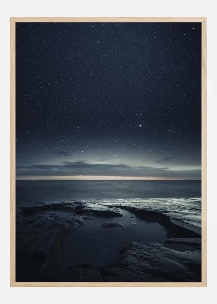 Un imprimeu fantastic al unei plaje stâncoase cu apă care reflectă cerul clar și violet cu stele sclipitoare. Orizontul este vizibil clar datorită unui fascicul de lumină albă care se întinde peste mare. Acesta este un poster rar cu magie de seară, pregătit să aducă un strop de energie în casa ta.
