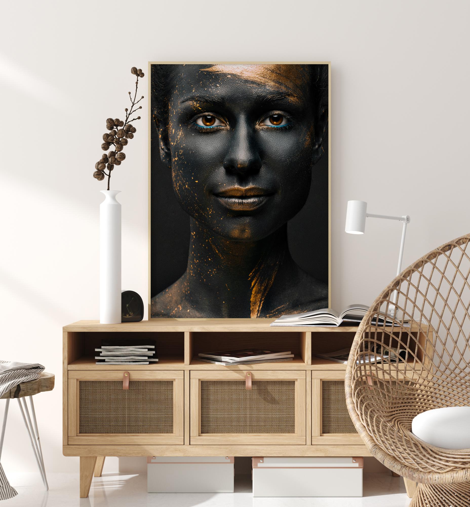 Un poster-portret alb-negru care înfățișează o doamnă zâmbitoare cu fața vopsită în gri. Fața femeii este stropită cu vopsea aurie pe frunte, buze și gât. Ochii femeii, care privesc direct în cameră, sunt accentuați cu tuș albastru, creând un aspect intens. Această imprimare frumoasă arată o imagine a unei frumuseți perfecte care va lumina casa ta.