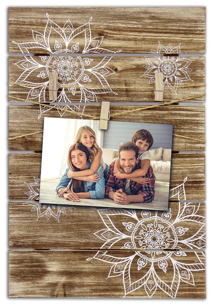 Aceasta este o frumoasă ramă colaj în care fotografiile sunt atașate cu cleme decorative din lemn. Fotografiile sunt fixate pe un fundal de lemn cu flori vopsite în alb într-un design boem. Rama are loc pentru două fotografii de 10x15 cm. Dimensiunile exterioare ale ramei sunt 32x48,5 cm. Această ramă colaj poate fi combinată frumos pe perete cu alte tablouri pentru a crea un ansamblu elegant în casa ta. Suportul de perete este disponibil.