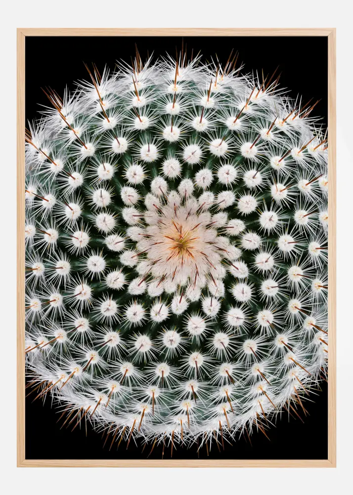 O fotografie aeriană a unui cactus cu flori albe. Pe un fundal negru, culoarea verde închis evidențiază florile albe și spinii ascuțiți. Partea centrală a plantei are o nuanță ușor galbenă, ceea ce adaugă un plus de culoare afișului. Un poster perfect pentru toți cei care iubesc plantele.