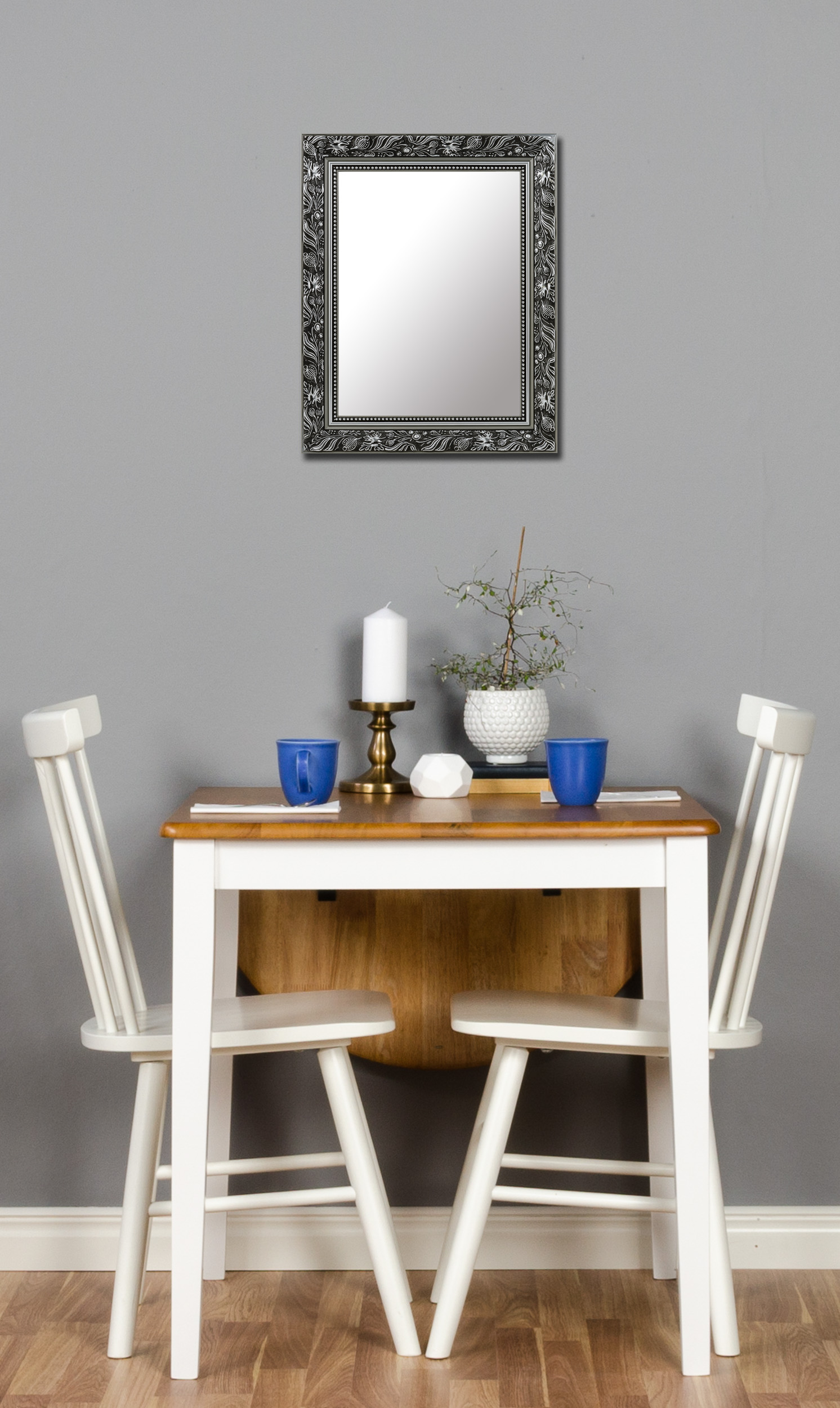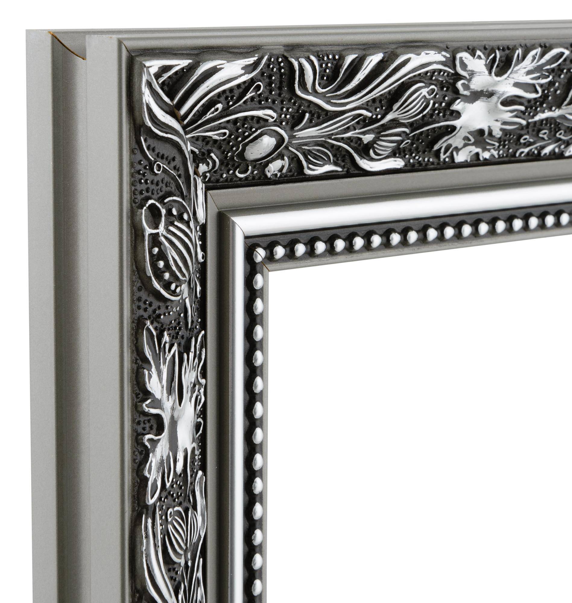 Oglindește-te cu stil în această oglindă elegantă care vine în negru și argintiu! Rama oglinzii are atât detalii mate, cât și lucioase, ceea ce o face foarte decorativă. În față există o porțiune largă cu model de frunze, zone netede în argintiu mat și lucios, precum și o bandă cu model de perle aproape de sticlă. Deoarece oglinda este fabricată de personal priceput în propria noastră atelier de rame, te poți aștepta la un produs de înaltă calitate!
