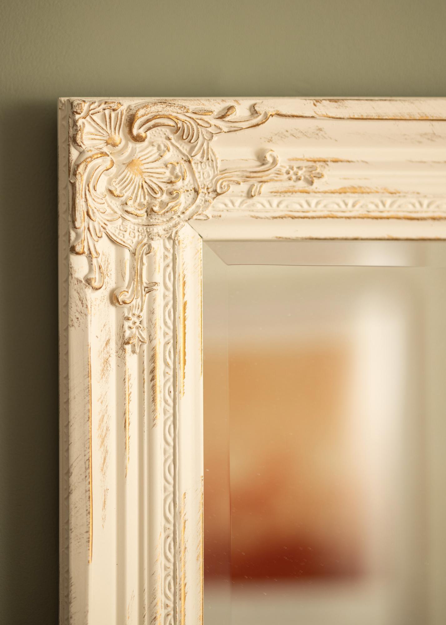 Oglinda Antique Alb este o oglindă de perete cu format și formă tradiționale. Are o ramă din lemn cu un decor clasic frumos proiectat, turnat din ghips și apoi aplicat pe ramă. Această ramă face ca oglinda să fie un ornament frumos care va atrage privirile.