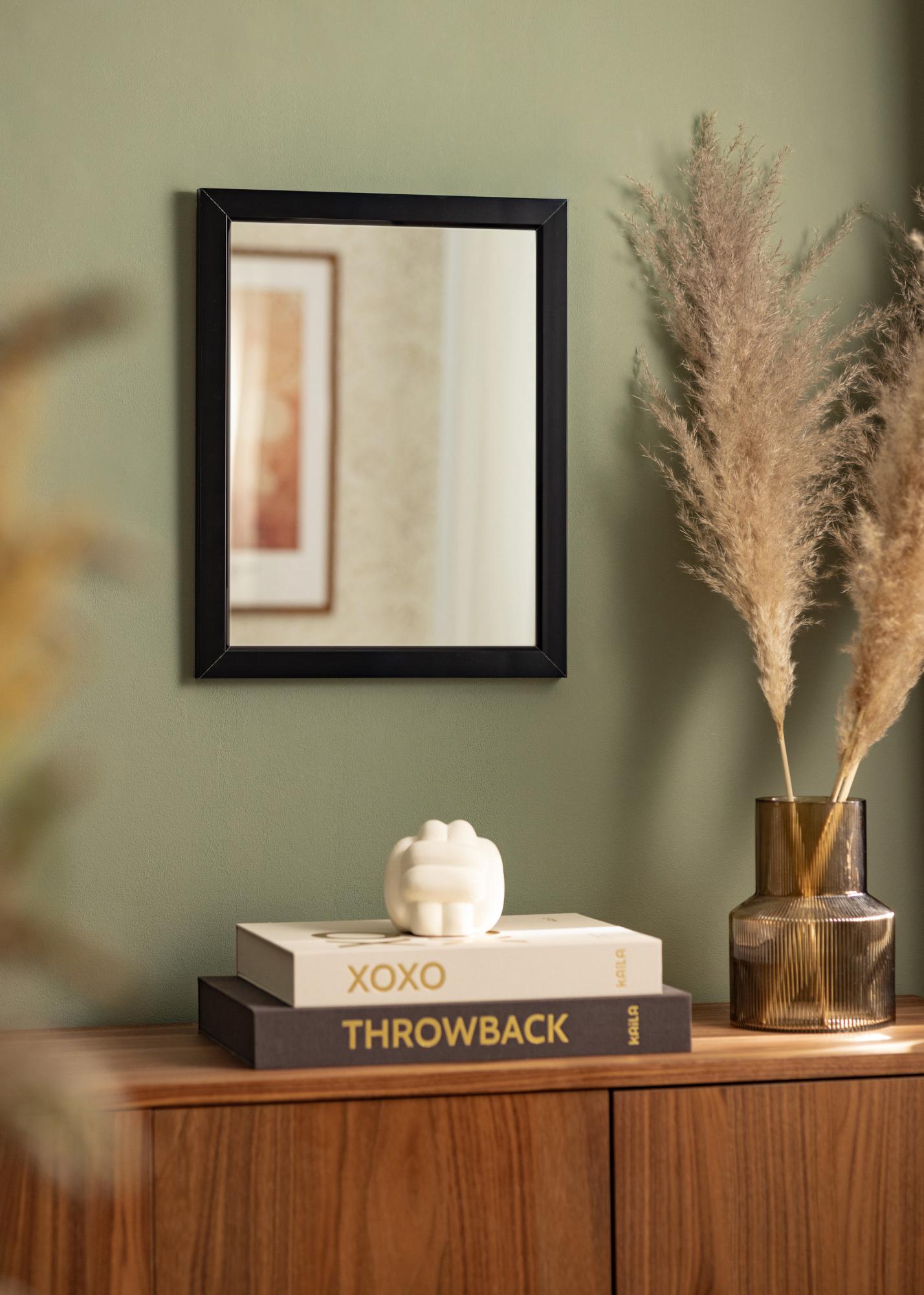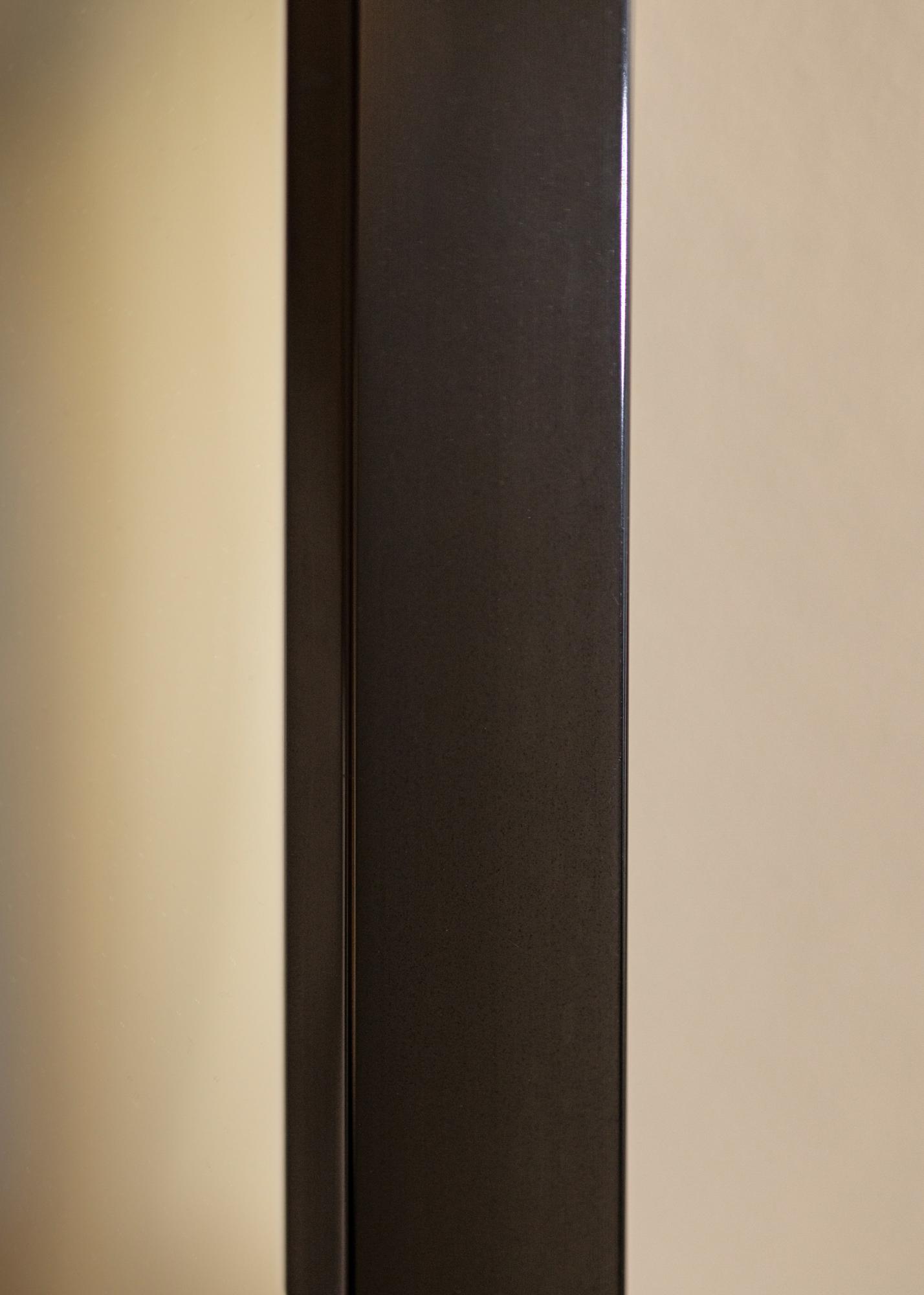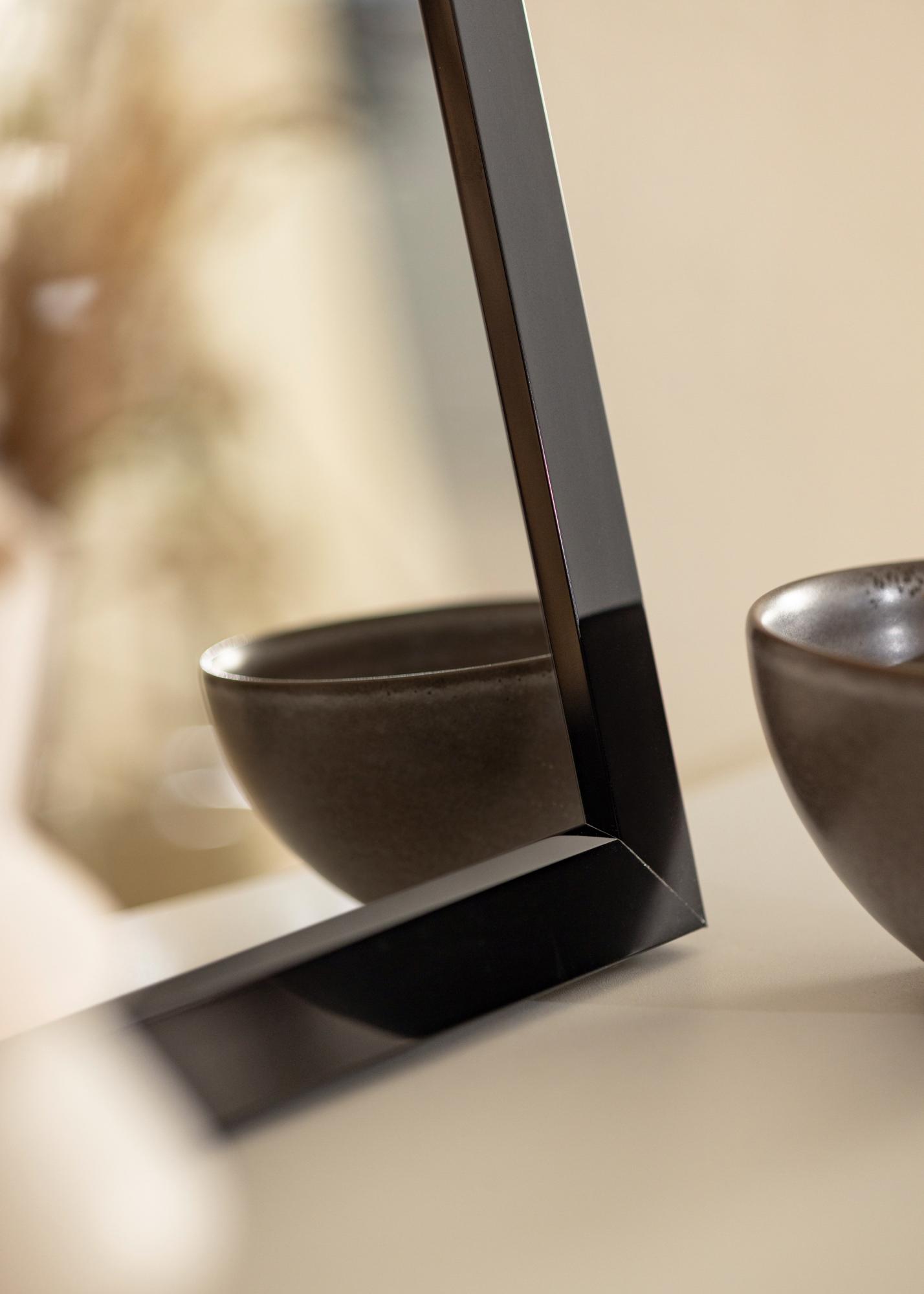 Oglindă neagră stilată cu luciu ridicat, cu o ramă realizată din aluminiu cu o fațetă interioară. Senzația masculină a oglinzii grafice poate oferi un contrast interesant unei interioare mai moi, dar finisajul lucios face ca oglinda să se potrivească bine și în amenajările industriale moderne. Agățați oglinda alături de postere sau tablouri grafice cu rame negre. Prin plasarea acesteia în fața unei ferestre se creează un spațiu în cameră.