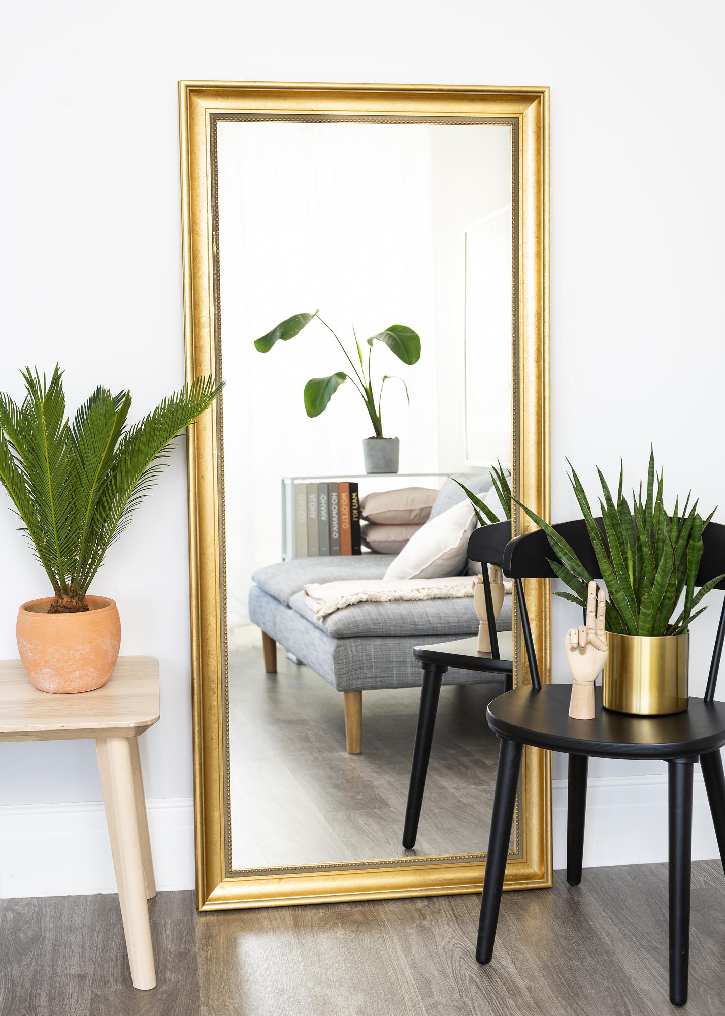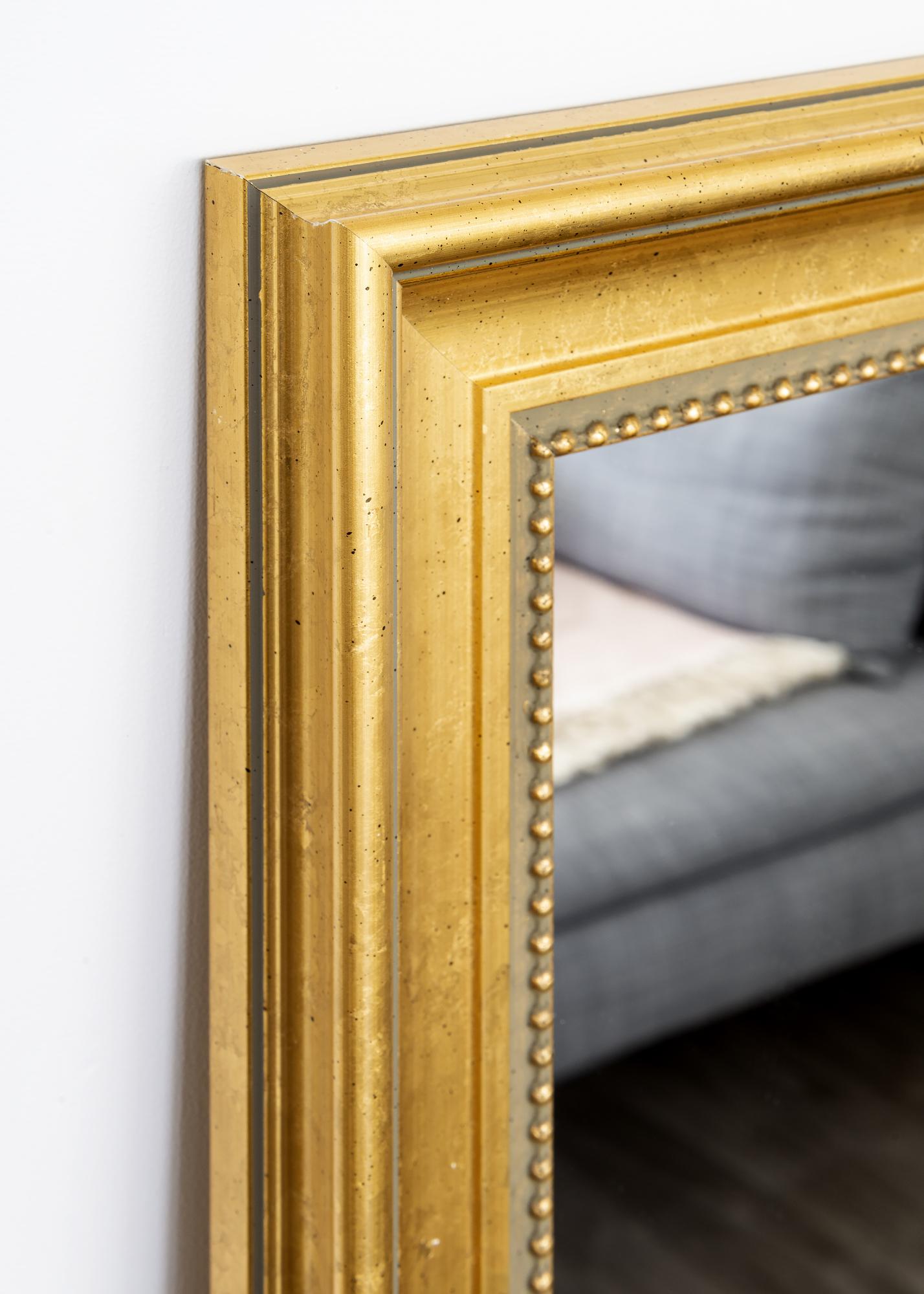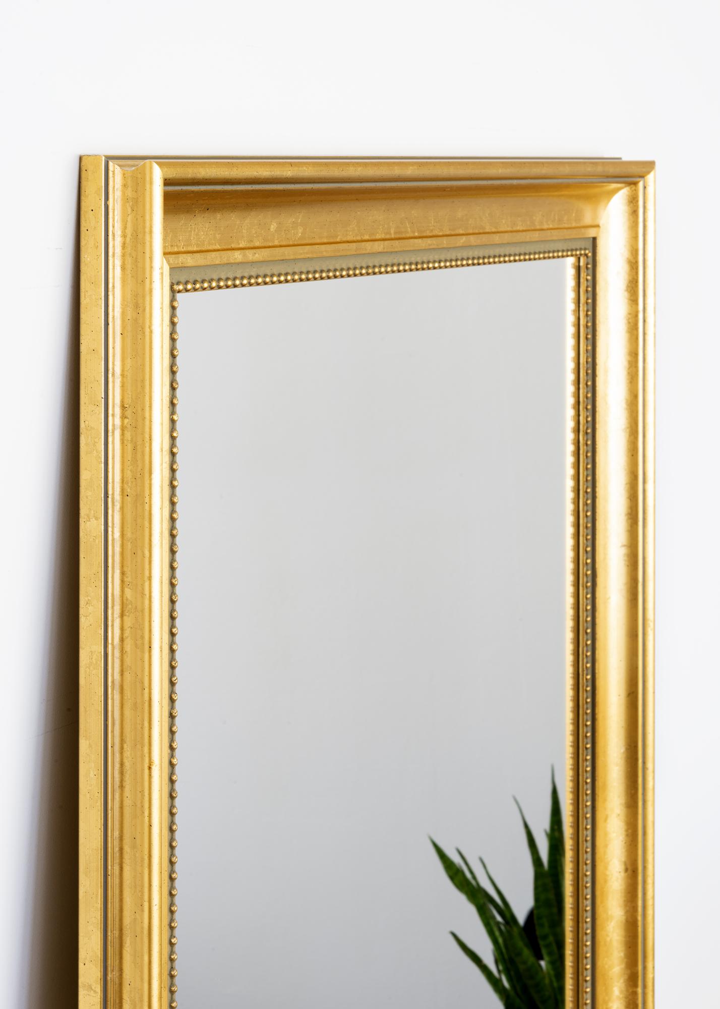 Achiziționați o oglindă elegantă și faceți interiorul holului, sufrageriei sau băii și mai luxos. Această oglindă stilată este disponibilă în mai multe dimensiuni, astfel încât să găsiți cu ușurință una care să se potrivească scopului dumneavoastră. Rama oglinzii are un design clasic cu un cadru larg și un model discret de perle lângă sticlă. Lemnul provine dintr-o silvicultură durabilă și este vopsit într-o nuanță frumoasă de aur.