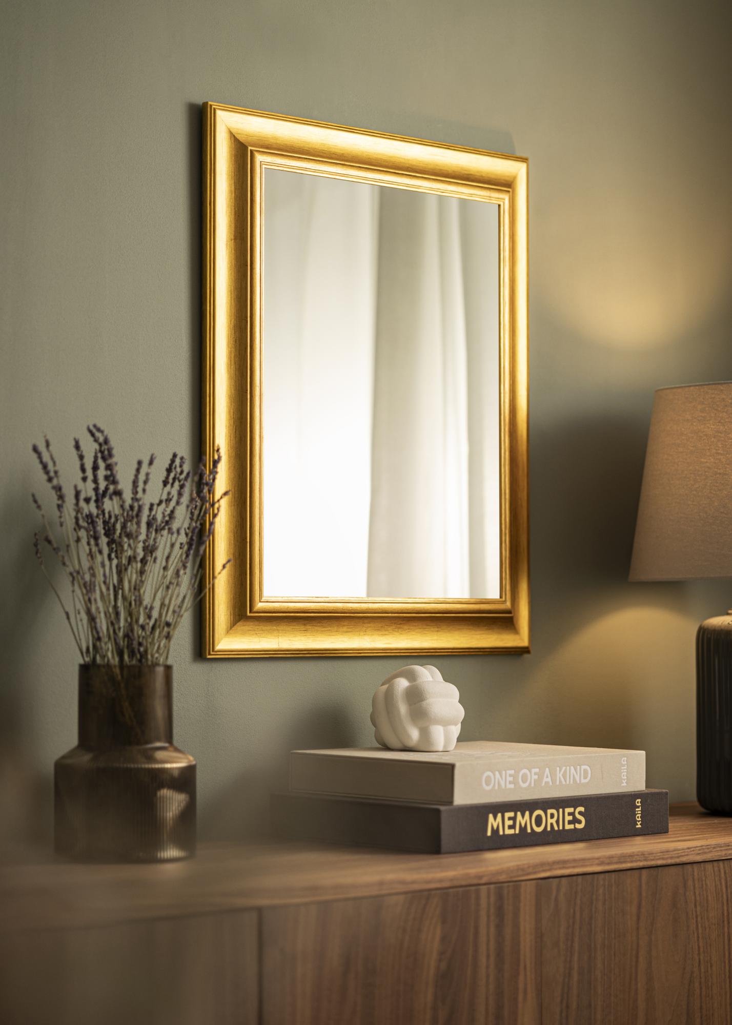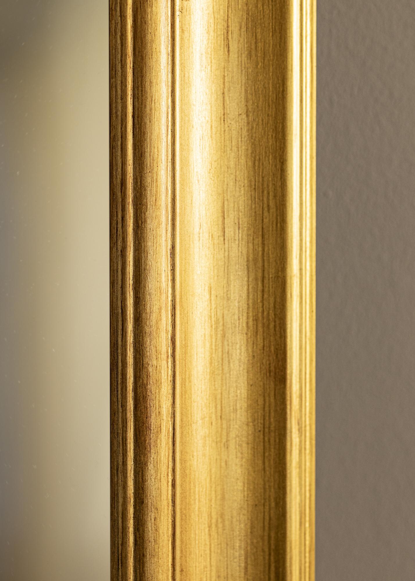 Rama este fabricată din pin și are un finisaj frumos auriu antic. Suprafața periată cu nuanțe subtile oferă oglinzii o senzație ușor patinată, contribuind la caracterul său unic. Liniile subțiri de-a lungul marginilor creează o bogăție sofisticată de detalii care atrage privirea și întărește expresia clasică a oglinzii.