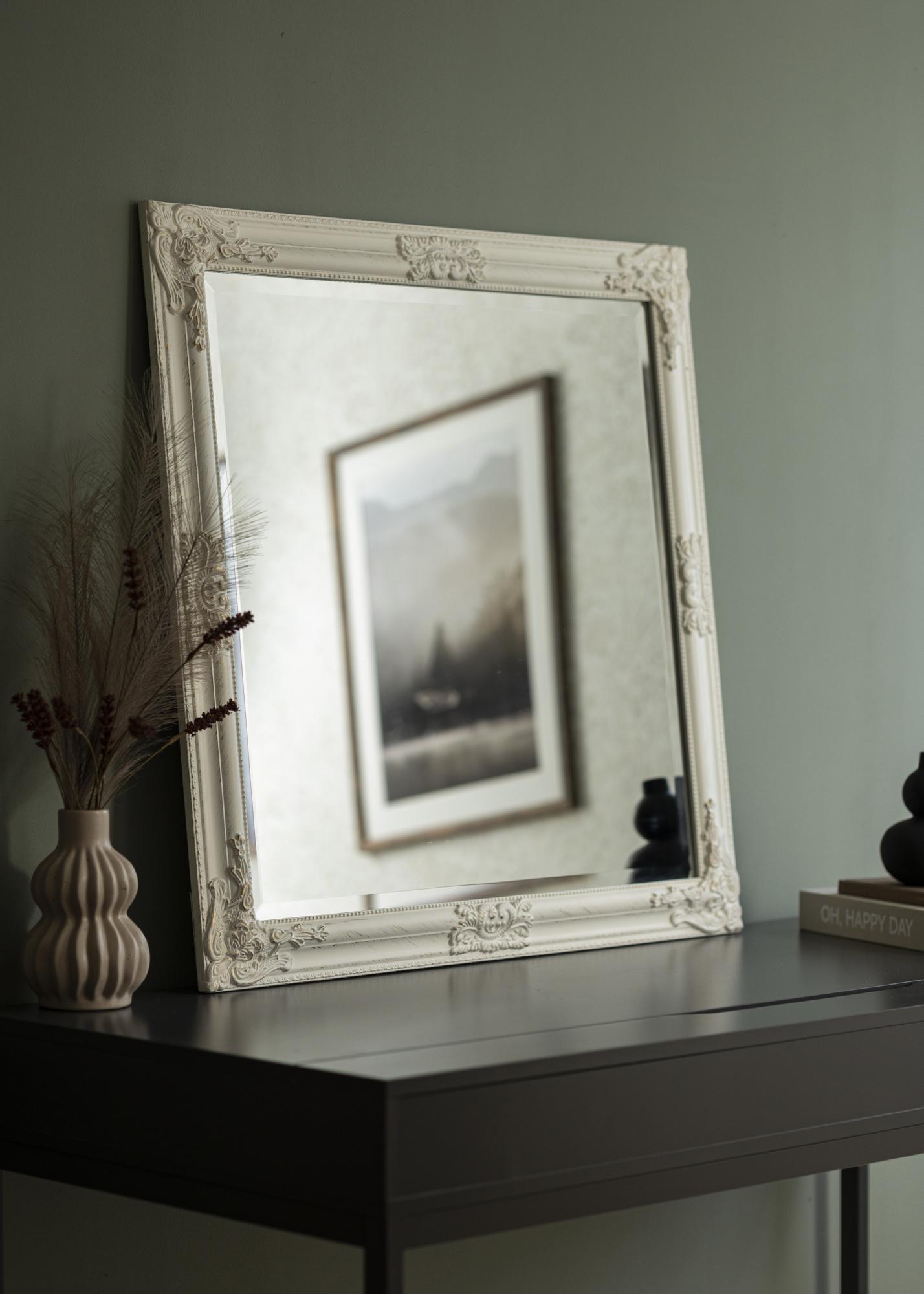 Descoperiți oglinda eleganta pătrată care măsoară 80x80 cm, o dimensiune perfectă pentru a fi atât funcțională, cât și decorativă în casa dumneavoastră. Această oglindă are o formă pătrată care oferă o senzație simetrică și echilibrată, ceea ce o face un element atrăgător în orice cameră. Rama albă este bogat ornamentată cu detalii de inspirație clasică, creând astfel un aspect de eleganță și farmec atemporal.