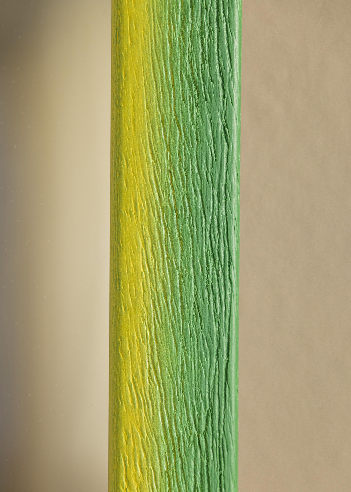 Această oglindă se remarcă prin paleta sa de culori vii, unde o tranziție moale de la galben solar la verde luxuriant creează o atmosferă armonioasă și primitoare. Suprafața este marcată de o structură distinctă de lemn cu vene adânci, oferind oglinzii o senzație tactilă care este atât modernă, cât și rustică. Tonurile de culoare se îmbină natural și creează un efect pictat manual cu o expresie organică, făcând fiecare oglindă unică în felul său.