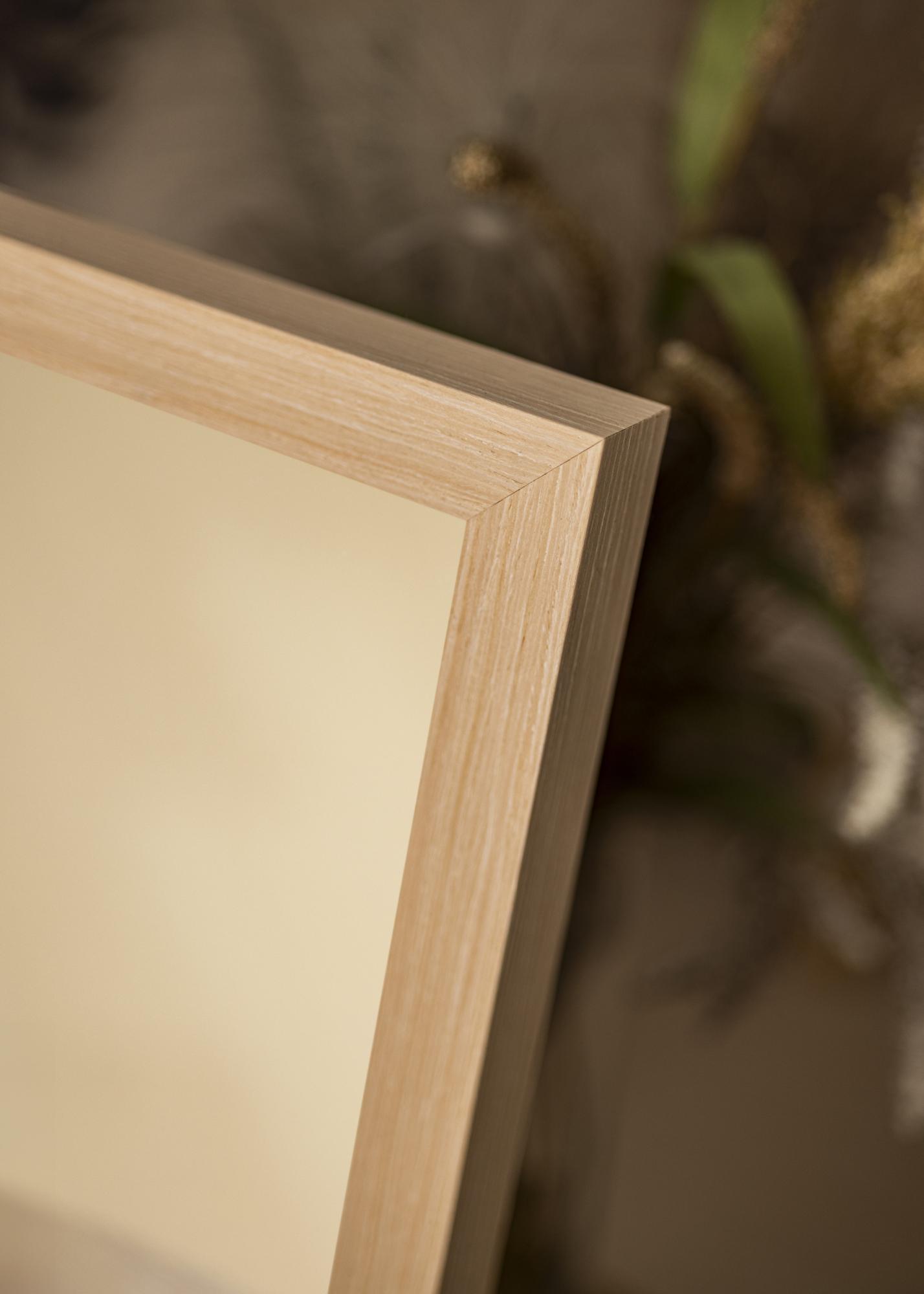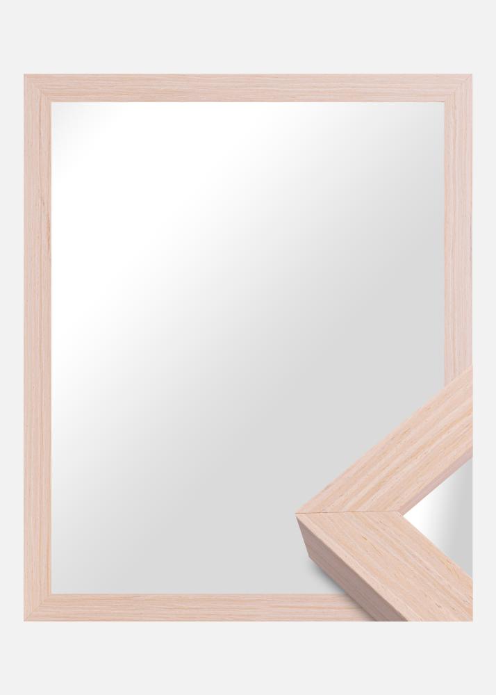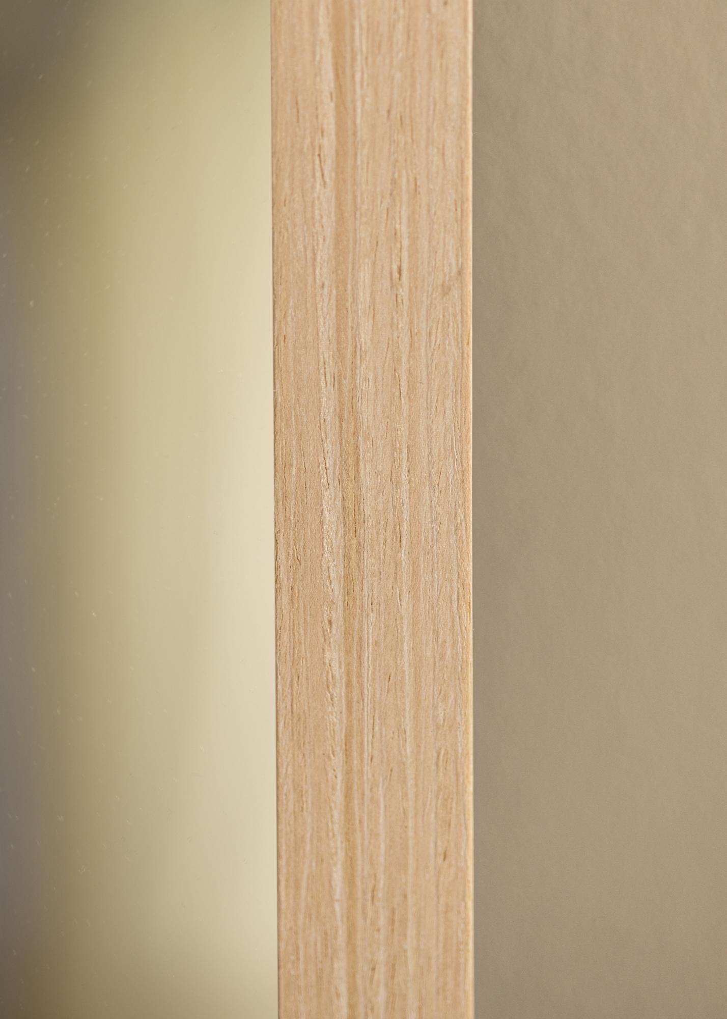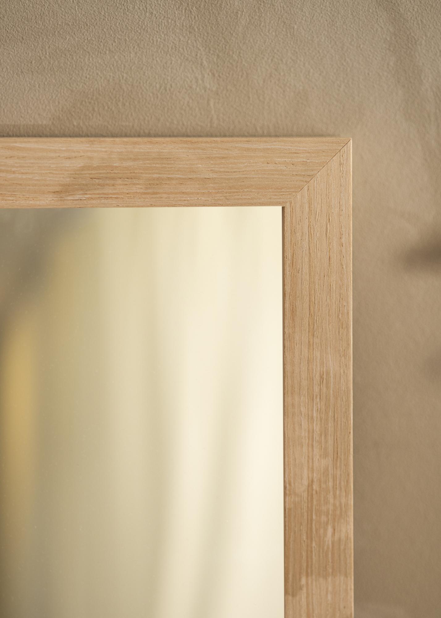 Rama oglinzii are o lățime de 28 mm și o adâncime de 33 mm, oferind o senzație stabilă și robustă fără a domina camera. Fabricată din lemn de pin, îmbină durabilitatea cu o lejeritate care face ca oglinda să fie ușor de manevrat și montat. Finisajul mat satinat evidențiază structura naturală a lemnului fără a reflecta lumina, creând o atmosferă plăcută în cameră.