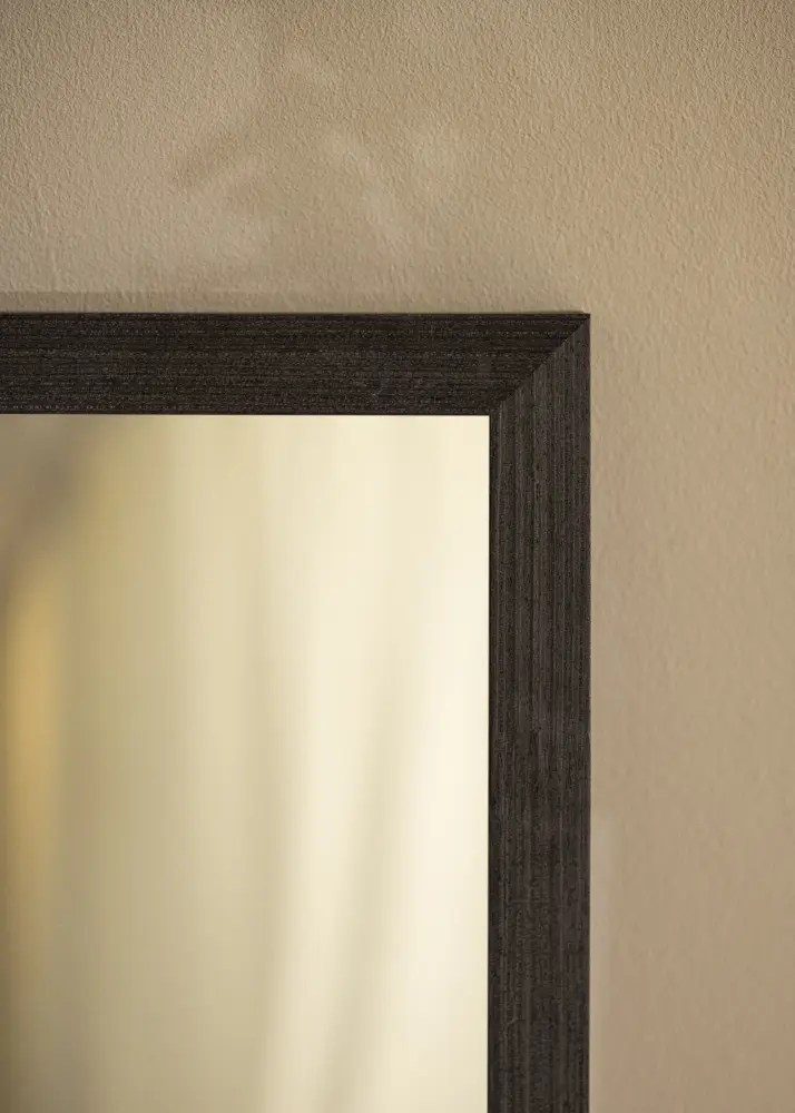Rama oglinzii are o lățime de 28 mm și o adâncime de 33 mm, ceea ce oferă o senzație stabilă și robustă fără a domina camera. Culoarea neagră a ramei adaugă o notă modernă și creează un contrast frumos cu sticla oglinzii. Fabricată din pin, această oglindă oferă atât durabilitate, cât și o senzație naturală care completează aspectul său elegant.